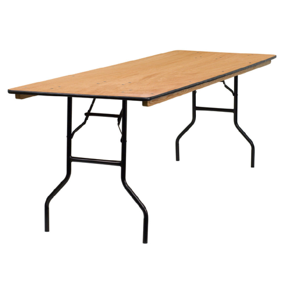 The Flash Furniture YT-WTFT30X96-TBL-GG Folding Banquet Table, measuring 96"W x 30"D x 30-1/4"H, is expertly crafted for versatility and durability, accommodating up to 10 adults with ease. This rectangular table showcases a 1/2" thick plywood top, finished with a clear coat for enhanced durability and aesthetic appeal. Its edges are reinforced with a black PVC T-mold, ensuring longevity and resistance against wear and tear. The table's sturdy foundation is supported by 18 gauge steel wishbone legs, finished with a black powder coating for added protection against corrosion. Designed for commercial use, these legs are equipped with protective floor caps to prevent damage to flooring surfaces. With a static load capacity of 661 pounds, this table is engineered to withstand significant weight, making it ideal for a variety of settings, from event spaces to conference rooms. The table's design ensures it can be efficiently stored and transported, as in-stock items typically ship within 24 hours. This folding banquet table represents a harmonious blend of functionality and resilience, catering to the diverse needs of businesses across different market segments.