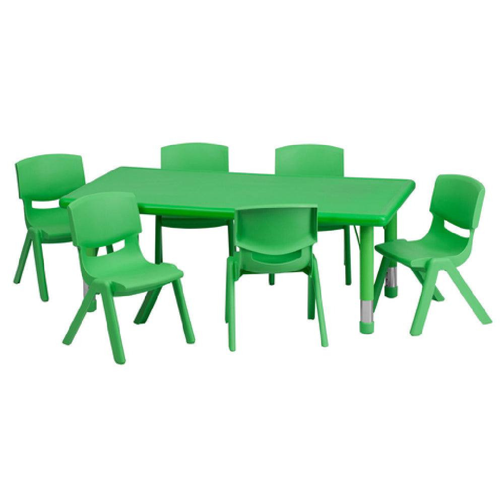The Flash Furniture YU-YCX-0013-2-RECT-TBL-GREEN-E-GG Preschool Activity Table Set is a versatile and durable choice for educational settings, combining functionality with a vibrant design. This set features a rectangular table measuring 48 inches in width and 24 inches in depth, with an adjustable height ranging from 14-1/2 inches to 23-3/4 inches, allowing it to accommodate various activities and age groups. The table boasts a plastic top with safety-rounded corners, ensuring a safe environment for young children. Its extending steel legs provide stability and support, withstanding a static load capacity of up to 220 pounds. Complementing the table are six stacking school chairs, each with a 10-1/2 inch seat height and a static load capacity of 154 pounds. These chairs are crafted from a one-piece polypropylene plastic shell, offering a lightweight yet sturdy construction. They can be stacked up to 10 chairs high, facilitating efficient storage and space management. Shipped in two boxes, the set requires assembly, with in-stock items typically shipping within 24 hours. This activity table set is ideal for preschools, daycare centers, and other educational environments seeking durable and adaptable furniture solutions.