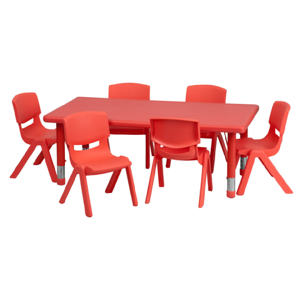 Flash Furniture YU-YCX-0013-2-RECT-TBL-RED-E-GG Preschool Activity Table Set is a versatile and durable choice for early childhood educational environments. The set includes one rectangular table with dimensions of 48"W x 24"D and an adjustable height range of 14-1/2" to 23-3/4", making it adaptable to various activities and child heights. Constructed with a plastic top and extending steel legs, the table offers a static load capacity of 220 lbs, ensuring stability and safe use. Safety is prioritized with rounded corners to prevent injuries during active play. The set also includes six stacking school chairs, each with a seat height of 10-1/2" and a static load capacity of 154 lbs. These chairs are designed with a contoured, one-piece polypropylene plastic shell, providing a lightweight and stackable solution—up to 10 chairs high—facilitating easy storage and classroom organization. The vibrant red color adds an engaging aesthetic to any preschool setting. Shipped in two boxes, the set requires assembly but is typically dispatched within 24 hours for in-stock items, offering a prompt solution for educational facilities seeking durable and flexible furniture options that cater to a dynamic learning environment.