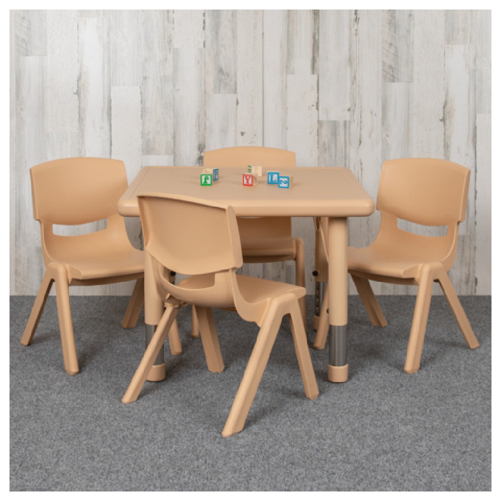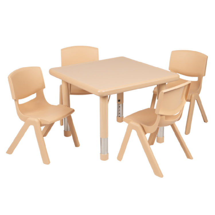 The Flash Furniture YU-YCX-0023-2-SQR-TBL-NAT-E-GG Preschool Activity Table Set is a versatile furniture solution designed for early childhood educational environments. This set includes a square table with dimensions of 24 inches wide, 24 inches deep, and an adjustable height ranging from 14-1/2 inches to 23-3/4 inches, accommodating various seating needs. The table boasts a plastic top with safety-rounded corners, ensuring a secure and child-friendly surface. Supported by extending steel legs, it can withstand a static load capacity of 220 pounds, making it durable for daily use. Accompanying the table are four stacking school chairs, each featuring a 10-1/2-inch seat height and a static load capacity of 154 pounds. These chairs are crafted with a contoured, one-piece polypropylene plastic shell, offering lightweight convenience and easy storage by stacking up to 10 chairs high. This product is shipped in two boxes and typically dispatched within 24 hours for in-stock items. Its practical design and reliable construction cater to preschools, daycare centers, and other educational settings, offering a balanced combination of functionality and safety for young learners.