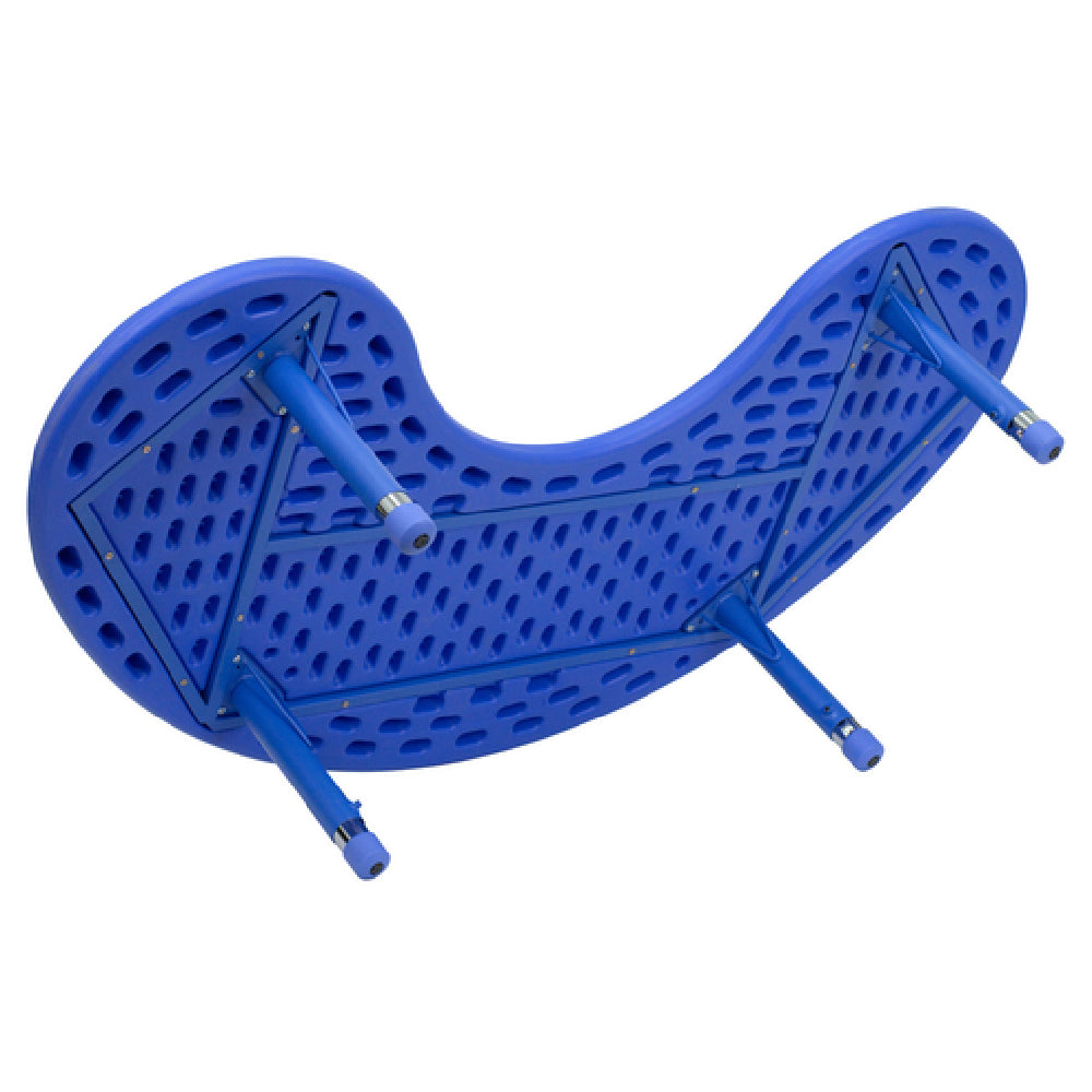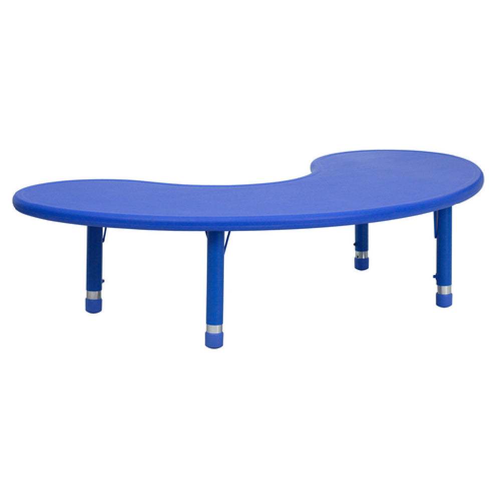The Flash Furniture YU-YCX-004-2-MOON-TBL-BLUE-GG Preschool Activity Table is a versatile and practical solution for early education environments, combining durability with adjustability to meet diverse classroom needs. Measuring 65 inches in width and 35 inches in depth, this table features a half-moon design, accommodating up to 8 children or 6 children and 1 adult, making it suitable for group activities and collaborative learning. The table's height is adjustable from 14-1/2 inches to 23-3/4 inches, allowing it to complement school chairs ranging from 6-1/2 inches to 14 inches in height. With a 220 lb. static load capacity, it offers robust support for various activities. Crafted with a blue plastic top and safety-rounded corners, it ensures a safe and vibrant learning environment. The extending steel legs enhance stability and support, making it a reliable choice for preschools. Assembly is required, and it is shipped in two boxes, with in-stock items typically dispatched within 24 hours. This preschool activity table is an excellent investment for educational institutions seeking a functional and adaptable piece of furniture that fosters interaction and creativity among young learners.