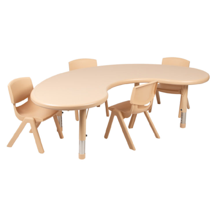 The Flash Furniture YU-YCX-0043-2-MOON-TBL-NAT-E-GG Preschool Activity Table Set is designed to cater to diverse educational environments with its practical and durable features. This set includes one table measuring 35"W x 65"D, with an adjustable height range from 14-1/2" to 23-3/4", accommodating various age groups and activities. The table boasts a half-moon shape, constructed with a sturdy plastic top and safety-rounded corners, ensuring a safe and engaging space for young learners. Its extending steel legs provide robust support with a static load capacity of 220 lbs. Accompanying the table are four stacking school chairs, each featuring a 10-1/2" seat height. These chairs are crafted from a contoured, one-piece polypropylene plastic shell, offering a lightweight and ergonomic design. With a static load capacity of 154 lbs and the ability to stack up to 10 chairs high, they are practical for storage and versatile in use. Shipped in two boxes, this set requires assembly and is usually ready for dispatch within 24 hours when in stock. This preschool activity table set is an invaluable asset for educational institutions, combining safety, functionality, and adaptability to meet the demands of different learning environments.