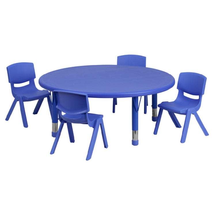 The Flash Furniture YU-YCX-0053-2-ROUND-TBL-BLUE-E-GG Preschool Activity Table Set is a versatile solution designed for early childhood educational environments. This set includes a round table measuring 45 inches in diameter with an adjustable height ranging from 14-1/2 inches to 23-3/4 inches, ensuring adaptability to various classroom setups. The table boasts a static load capacity of 220 lbs, reinforced with a plastic top and safety-rounded corners for enhanced durability and child safety. Supporting the table are extending steel legs, which ensure stability and longevity. Accompanying the table are four stacking school chairs, each with a seat height of 10-1/2 inches and a static load capacity of 154 lbs. These chairs feature a contoured, one-piece polypropylene plastic shell and a lightweight design, allowing them to be stacked up to 10 chairs high for efficient space utilization. Available in a vibrant blue color, this set promotes an engaging learning environment. Assembly is required, and the product is conveniently shipped in two boxes, with in-stock items typically shipping within 24 hours. This activity table set is an ideal choice for preschools seeking durable, adaptable, and space-efficient furniture solutions.
