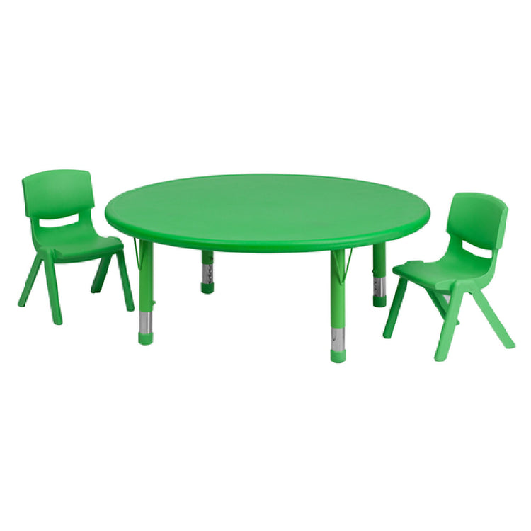 The Flash Furniture YU-YCX-0053-2-ROUND-TBL-GREEN-R-GG Preschool Activity Table Set is a versatile and durable solution for early childhood education environments. This set includes a round table with a diameter of 45 inches and an adjustable height ranging from 14.5 inches to 23.75 inches, catering to various age groups and activities. The table features a plastic top with safety-rounded corners, ensuring a child-safe surface that can withstand a static load capacity of 220 pounds. The extending steel legs provide stability and adaptability to different settings. Accompanying the table are two stacking school chairs, each with a seat height of 10.5 inches and a static load capacity of 154 pounds. The chairs are designed with a contoured, one-piece polypropylene plastic shell for comfort and durability, and they can be stacked up to 10 chairs high for efficient storage. The lightweight design of the set enhances mobility and ease of assembly, making it an ideal choice for preschools, daycare centers, and early learning facilities. The vibrant green color adds a lively touch to any classroom environment. Shipped in two boxes, the set is usually dispatched within 24 hours, ensuring timely delivery for immediate use.