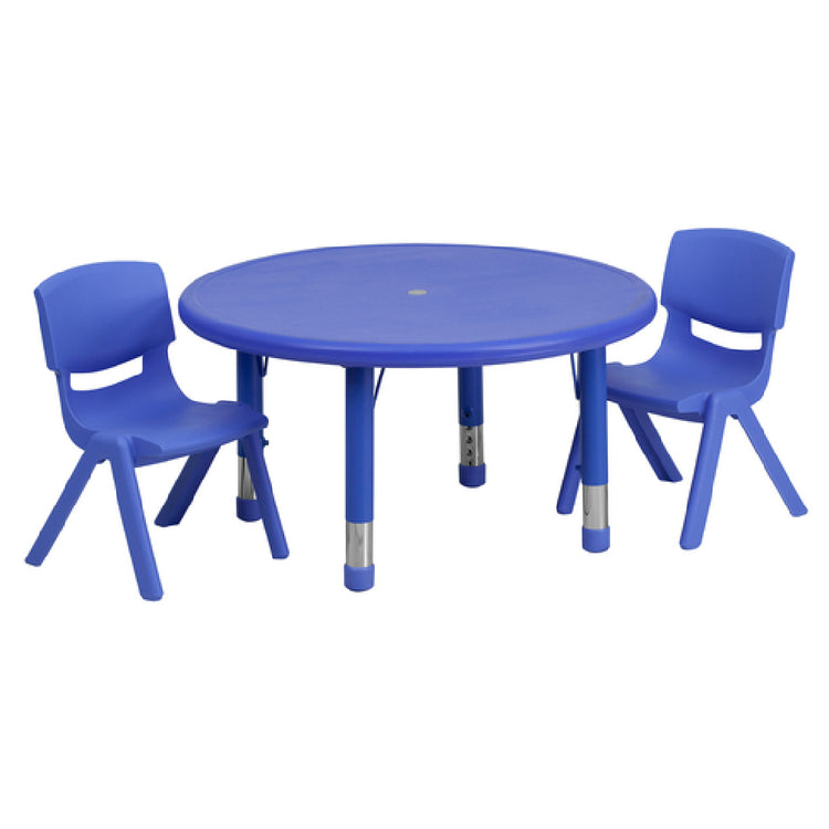 The Flash Furniture YU-YCX-0073-2-ROUND-TBL-BLUE-R-GG Preschool Activity Table Set is a versatile and durable solution designed to meet the needs of educational environments. This set includes a round table with a 33-inch diameter and an adjustable height ranging from 14-1/2 inches to 23-3/4 inches, catering to various activity types and age groups. The table features a robust plastic top with safety-rounded corners to ensure a child-friendly design, supported by extending steel legs that provide a static load capacity of 220 pounds. Complementing the table are two stacking school chairs, each with a seat height of 10-1/2 inches and a static load capacity of 154 pounds. The chairs are crafted from a contoured, one-piece polypropylene plastic shell, ensuring lightweight ease of handling and stacking up to 10 chairs high for efficient storage. Shipped in two boxes, this activity table set requires assembly but is typically dispatched within 24 hours for in-stock items, making it a practical choice for preschools and early childhood education settings that require adaptable, space-efficient furniture. This product is particularly appealing to educational institutions looking for reliable, safe, and easy-to-maintain furniture solutions.