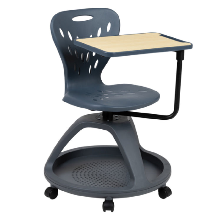 The Flash Furniture YU-YCX-019-DG-GG Laikyn Dark Gray Mobile Desk Chair with 360 Degree Tablet Rotation and Under Seat Storage Cubby is a versatile seating solution designed to enhance productivity and organization in diverse work environments. This chair features a unique 360-degree tablet rotation capability, which facilitates seamless multitasking and interaction in educational, office, or home settings. Its dark gray color offers a modern aesthetic that complements various interior designs. A standout feature is the under-seat storage cubby, providing convenient space for storing personal items or work essentials, thereby minimizing clutter and promoting efficiency. The mobile design ensures effortless movement across different surfaces, making it ideal for dynamic workplaces that require flexibility and adaptability. The chair's ergonomic construction supports comfort during extended use, making it suitable for professionals, students, and anyone seeking functional and stylish seating with integrated storage and technology capabilities. By combining these features, the Flash Furniture Laikyn Mobile Desk Chair addresses the needs of multiple market segments, including education and business, delivering a practical and innovative solution for contemporary workspaces.