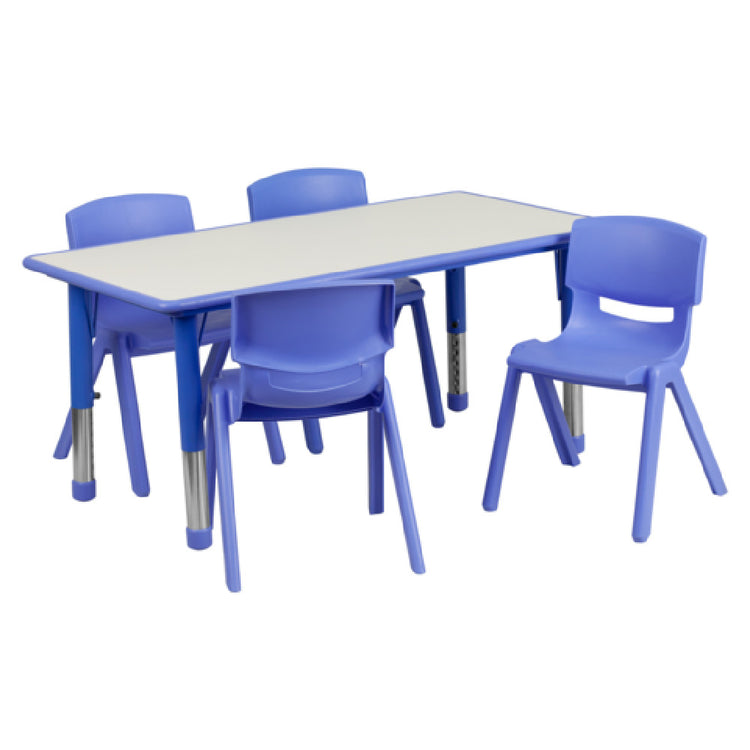 The Flash Furniture YU-YCY-060-0034-RECT-TBL-BLUE-GG Preschool Activity Table Set is a versatile and durable option for early childhood educational environments. This set features a rectangular table measuring 47-1/4 inches in width and 23-5/8 inches in depth, with an adjustable height ranging from 14-1/2 to 23-3/4 inches, allowing it to accommodate various activities and age groups. The table supports a static load capacity of 220 lbs and boasts a 1-inch thick laminate top with safety-rounded corners, ensuring both robustness and safety for young users. The table's plastic edges and extending steel legs contribute to its sturdy construction. Accompanying the table are four stacking school chairs, each with a seat height of 10-1/2 inches and a static load capacity of 154 lbs. These chairs are designed with a contoured, one-piece polypropylene plastic shell, offering a lightweight yet durable seating solution. The chairs stack up to ten high, facilitating easy storage and space management. The grey laminate and blue plastic color scheme adds a vibrant touch to any preschool setting. Assembly is required, and the set is shipped in two boxes, with in-stock items typically shipping within 24 hours. This product is ideal for preschool classrooms, daycare centers, and play areas where safety and functionality are paramount.