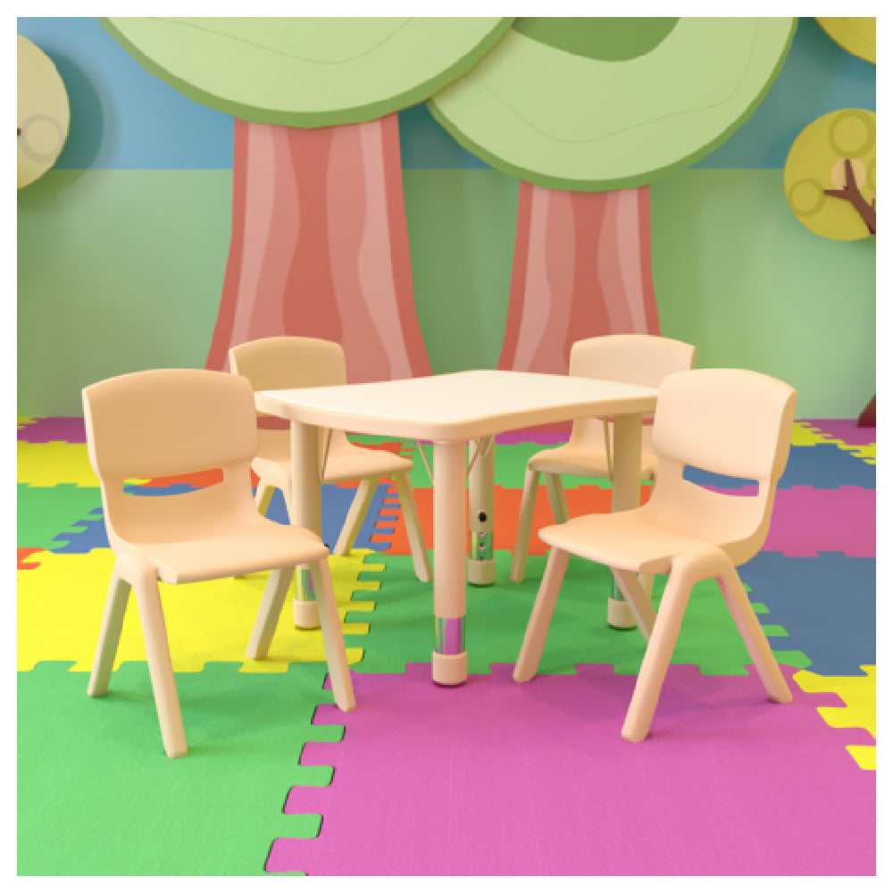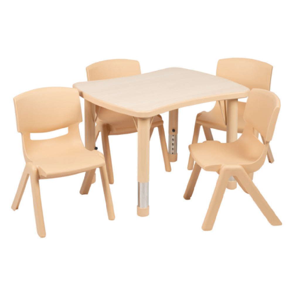 The Flash Furniture YU-YCY-098-0034-RECT-TBL-NAT-GG Preschool Activity Table Set is a thoughtfully designed educational tool, perfectly suited for early childhood learning environments. This set includes a rectangular table measuring 26-5/8"W x 21-7/8"D, with an adjustable height ranging from 14-1/2" to 23-3/4", accommodating various classroom needs. The table supports a static load capacity of up to 220 lbs, ensuring durability and stability. It features a 1" thick laminate top with a plastic edge and safety-rounded corners, providing a safe and resilient surface for young learners. The extending steel legs enhance its robustness and adaptability. Complementing the table are four stacking school chairs with a 10-1/2" seat height and a static load capacity of 154 lbs each. These chairs are constructed from a one-piece polypropylene plastic shell, offering a lightweight yet sturdy design, and can be conveniently stacked up to 10 chairs high for efficient storage. Shipped in two boxes, this set requires assembly and is generally dispatched within 24 hours when in stock. The natural finish of this preschool set blends seamlessly into any educational setting, making it a versatile choice for schools prioritizing both function and style.