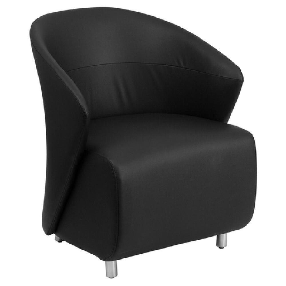 The Flash Furniture ZB-1-GG Reception Chair Curved Arms Taut Seat And Back exemplifies modern elegance and functional design, tailored for diverse reception and lounge environments. This chair features curved arms that enhance its aesthetic appeal while providing ergonomic comfort. The taut seat and back are upholstered in LeatherSoft, a blend of leather and polyurethane, offering a soft touch and increased durability. This material is particularly advantageous in high-traffic areas due to its wear resistance and ease of maintenance. Safety and comfort are paramount, with the incorporation of CA117 fire retardant foam, ensuring compliance with safety standards. The chair's stainless steel legs not only contribute to its contemporary look but also provide robust support and longevity. Floor glides are integrated into the design to protect flooring surfaces and ensure smooth movement. Finished in a sleek black, the Flash Furniture ZB-1-GG Reception Chair seamlessly fits into various interior decors, making it a versatile choice for businesses seeking to convey professionalism and style. Its thoughtful construction and material selection make it a reliable and attractive option for hospitality, corporate, and healthcare settings, where form meets function to enhance user experience.