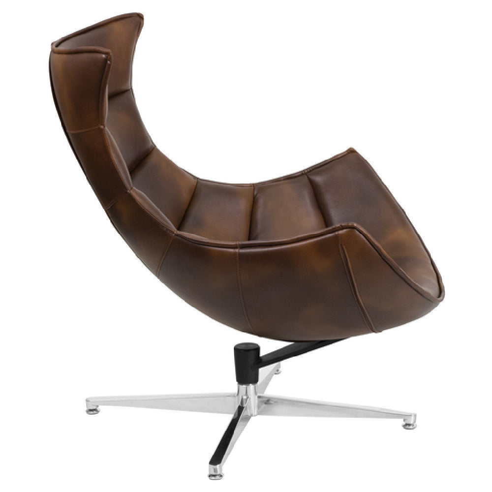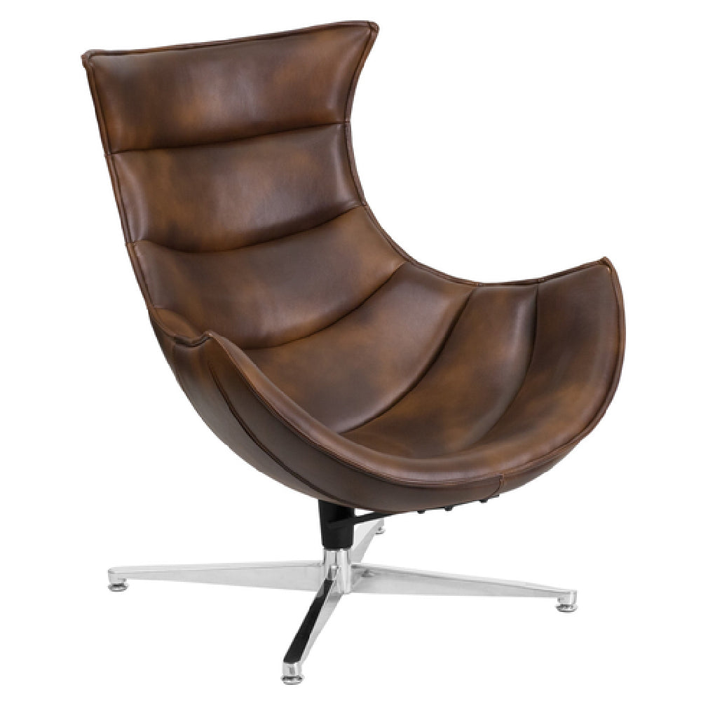 The Flash Furniture ZB-39-GG Swivel Cocoon Chair offers a retro style with a focus on comfort and durability, making it suitable for various market segments, from residential to commercial spaces. This chair is designed with integrated curved arms that enhance its unique cocoon-like silhouette, providing both aesthetic appeal and ergonomic support. Upholstered in LeatherSoft, a blend of leather and polyurethane, the chair ensures a soft and durable seating surface that is easy to maintain. Safety is a priority with CA117 fire retardant foam, offering peace of mind in compliance with fire safety standards. The chair’s stainless steel base not only adds to its sleek appearance but also provides robust support and stability. Adjustable floor glides are incorporated into the design, allowing for easy leveling on uneven surfaces and protecting floors from scratches. Available in bomber jacket brown, this chair requires assembly and is crafted for those who appreciate a blend of retro design and modern functionality. With in-stock items typically shipping within 24 hours, the Flash Furniture ZB-39-GG Swivel Cocoon Chair is a practical and stylish seating solution for anyone looking to enhance their space with a fashionable and functional piece.