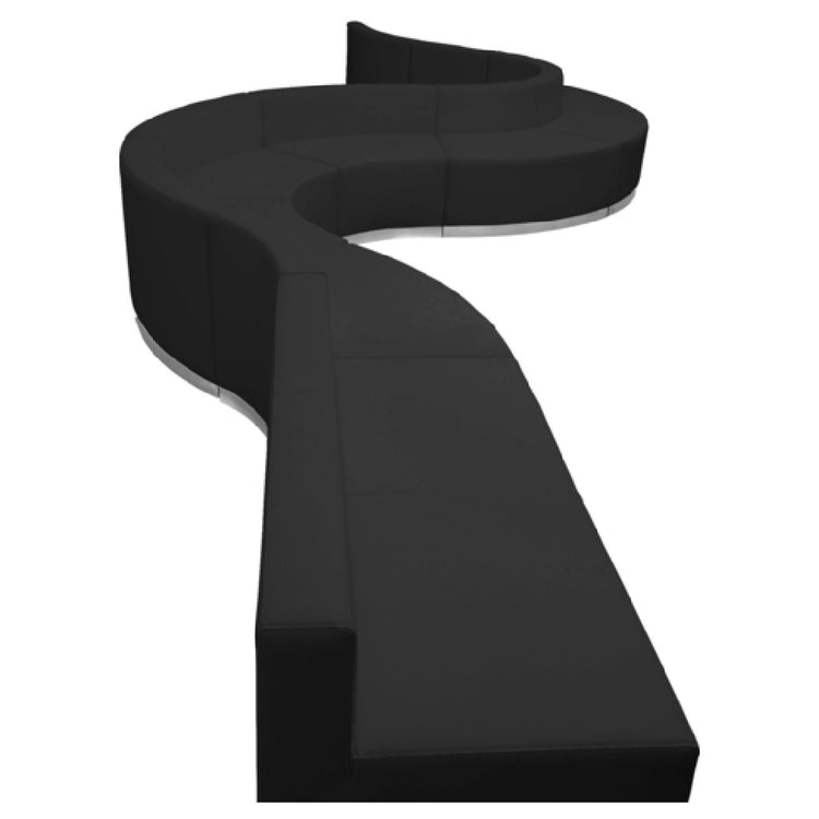 The Flash Furniture ZB-803-410-SET-BK-GG Hercules Alon Series Reception Configuration is designed for versatile and sophisticated reception settings. With overall dimensions of 197-1/2"W x 25-1/4" to 144-1/2"D x 27"H, this modular seating arrangement caters to various spatial needs and preferences within the hospitality and corporate environments. The configuration includes a single chair measuring 25-1/2"W x 25-1/4"D x 27"H, four concave chairs ranging from 21-1/2" to 41-1/2"W x 25-1/4"D x 27"H, three convex chairs with dimensions of 41-1/2" to 21-1/2"W x 25-1/4"D x 27"H, and a spacious loveseat at 51"W x 25-1/4"D x 27"H. Each piece is upholstered in LeatherSoft, a blend of leather and polyurethane, providing comfort and durability. The taut seat and back feature line stitching for a sleek appearance, complemented by a brushed stainless steel base. Safety and stability are assured with CA117 fire retardant foam and locking bolts for chair connection. Adjustable floor glides ensure an even setup on varied surfaces. Shipped in nine boxes, this product requires assembly and is typically ready for dispatch within 24 hours, making it a reliable choice for enhancing any reception area.