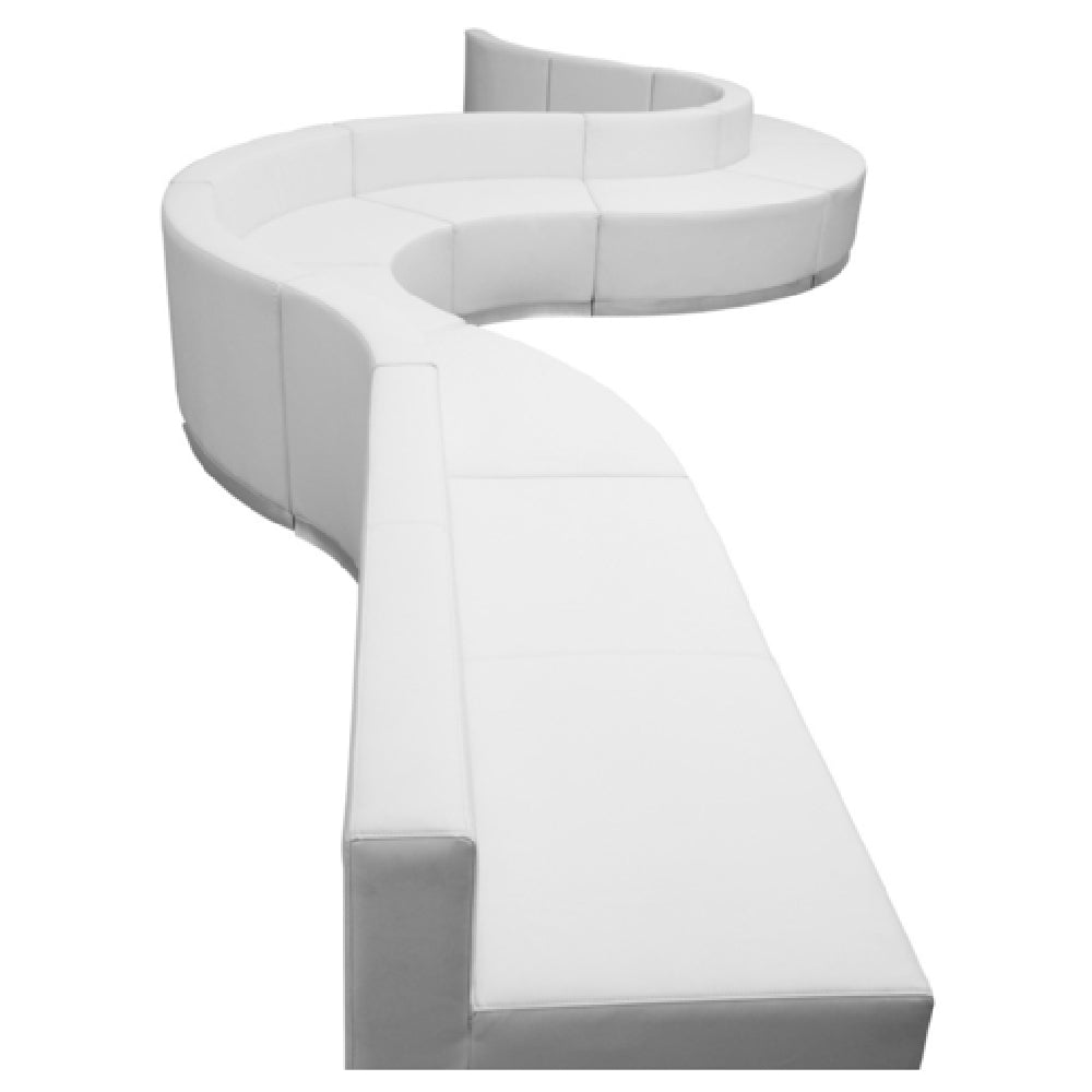 The Flash Furniture ZB-803-410-SET-WH-GG Hercules Alon Series Reception Configuration stands out for its modular design and versatility, making it an exceptional choice for a variety of professional environments. With an overall dimension of 197-1/2"W x 25-1/4" to 144-1/2"D x 27"H, this set includes one 25-1/2"W x 25-1/4"D x 27"H chair, four concave chairs ranging from 21-1/2" to 41-1/2"W x 25-1/4"D x 27"H, three convex chairs measuring 41-1/2" to 21-1/2"W x 25-1/4"D x 27"H, and a 51"W x 25-1/4"D x 27"H loveseat. The LeatherSoft upholstery provides a comfortable seating experience, enhanced by taut seat and back with line stitching to ensure durability. Safety and stability are prioritized through the use of CA117 fire retardant foam and a locking bolt system that connects the chairs. The brushed stainless steel base and adjustable floor glides add to the aesthetic appeal while facilitating easy setup and maintenance. This reception configuration is delivered in nine boxes, typically shipping within 24 hours for in-stock items, and requires assembly upon arrival. Available in white, this set is designed to meet the dynamic needs of reception areas and waiting rooms.