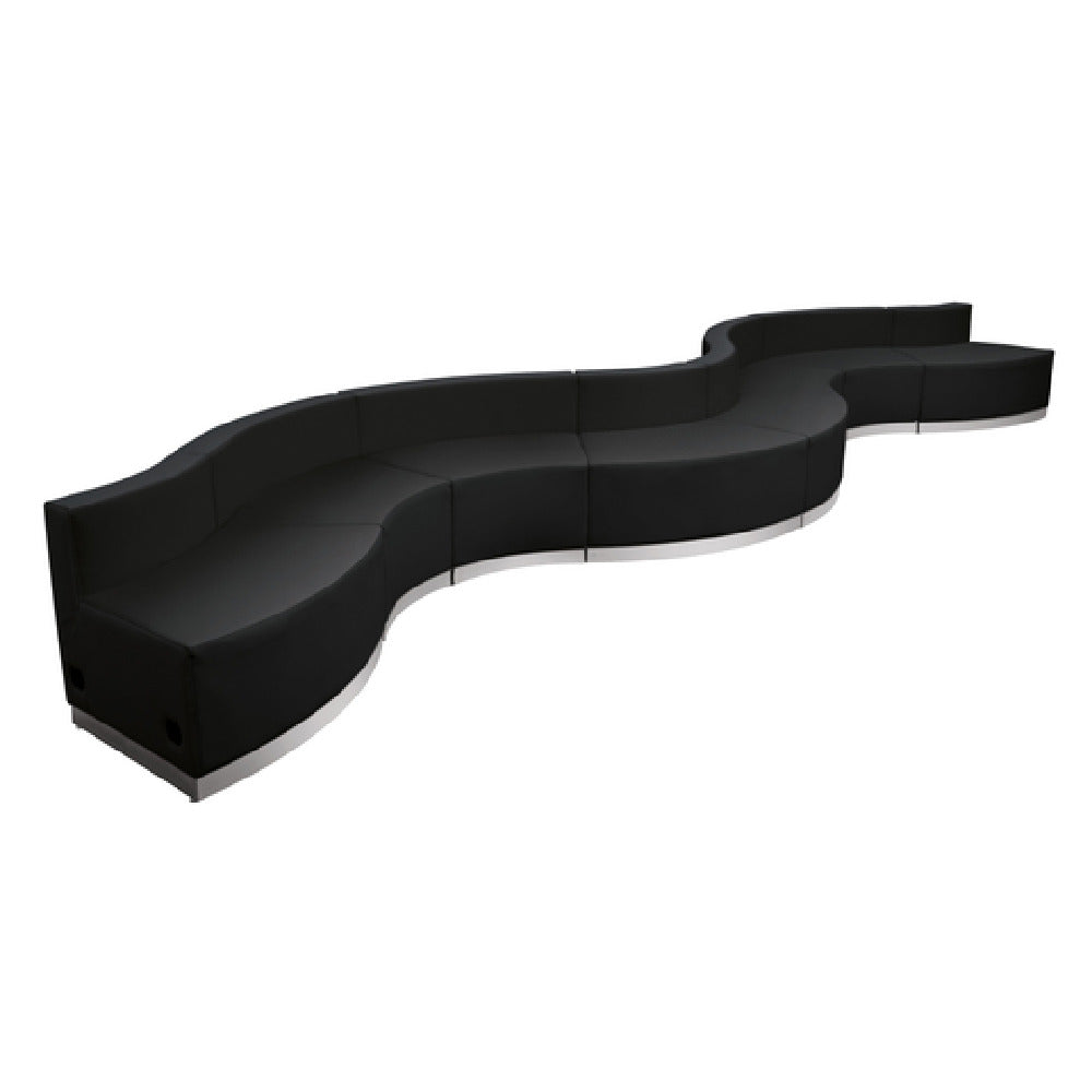 The Flash Furniture ZB-803-430-SET-BK-GG Hercules Alon Series Reception Configuration is a highly adaptable and modular furniture set designed to enhance reception areas with both style and functionality. With overall dimensions of 224-1/2"W x 25-1/4" to 49"D x 27"H, this configuration includes four concave chairs measuring 21-1/2" to 41-1/2"W x 25-1/4"D x 27"H and four convex chairs measuring 41-1/2" to 21-1/2"W x 25-1/4"D x 27"H. Each piece is upholstered in LeatherSoft, a durable blend of leather and polyurethane, ensuring comfort with its taut seat and back. The line stitching throughout adds a subtle elegance to the design. The use of CA117 fire retardant foam highlights its commitment to safety. For secure assembly, the chairs connect with a locking bolt, and the brushed stainless steel base adds stability and a modern touch. Adjustable floor glides ensure it fits seamlessly into any floor space. This set is shipped in eight boxes and usually dispatches within 24 hours for in-stock items, making it a practical choice for businesses seeking quick and efficient setup. Ideal for corporate offices, hotels, and professional environments, this reception configuration stands out for its versatility and sophisticated appearance.
