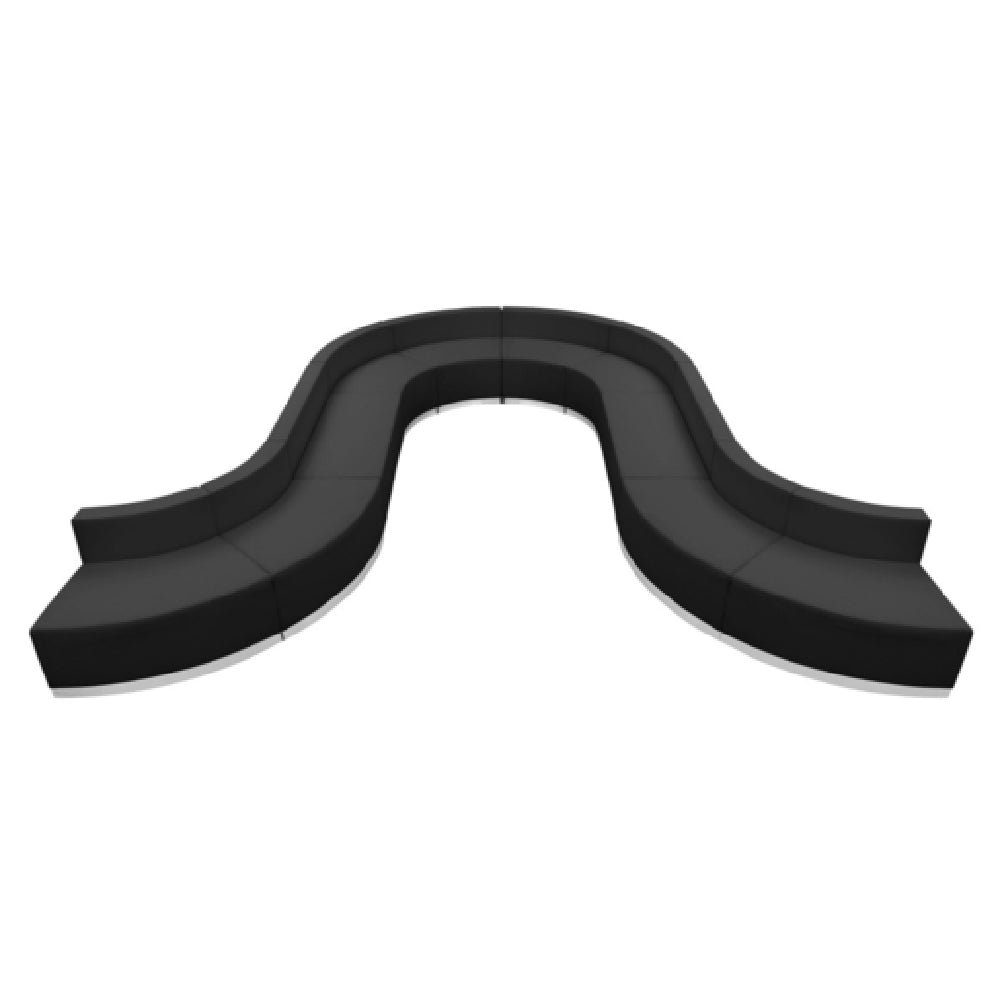 The Flash Furniture ZB-803-450-SET-BK-GG Hercules Alon Series Reception Configuration is a versatile seating solution designed for sophisticated reception areas. Measuring 158-1/2" wide and up to 156" deep, with a height of 27", this modular configuration includes eight uniquely shaped chairs and two loveseats. The set comprises four concave chairs and four convex chairs, each with dimensions varying between 21-1/2" to 41-1/2" in width and 25-1/4" in depth, while the loveseats measure 51" in width. Crafted with LeatherSoft upholstery, known for its combination of leather and polyurethane for added softness and durability, the series ensures comfort with its taut seat and back. Line stitching across the surfaces adds a touch of elegance. The incorporation of CA117 fire retardant foam underscores its safety standards. For structural integrity, the chairs feature a locking bolt connection system and rest on a brushed stainless steel base, complete with adjustable floor glides to accommodate uneven surfaces. Available in a classic black finish, this set requires assembly and is conveniently shipped in 10 boxes, with in-stock items typically dispatched within 24 hours. This reception configuration meets the demanding needs of corporate environments, offering both style and functionality.