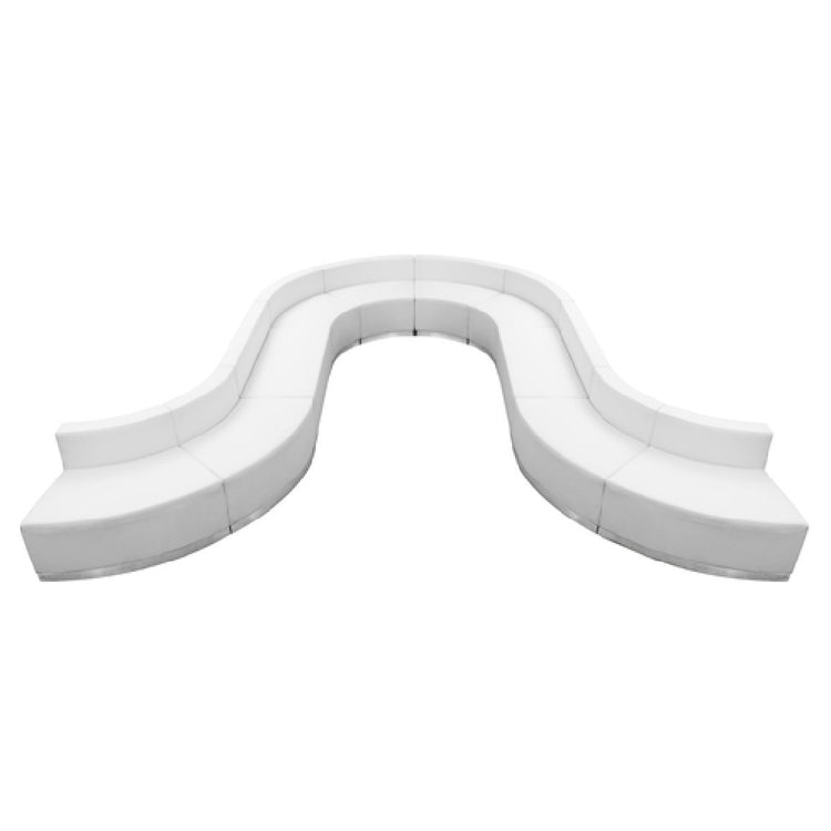 Flash Furniture ZB-803-450-SET-WH-GG Hercules Alon Series Reception Configuration is a sophisticated modular seating arrangement tailored for professional environments such as reception areas and waiting rooms. This configuration measures an impressive 158-1/2"W x 25-1/4" to 156"D x 27"H overall, providing ample seating space. It includes four concave chairs with dimensions ranging from 21-1/2" to 41-1/2"W x 25-1/4"D x 27"H and four convex chairs measuring 41-1/2" to 21-1/2"W x 25-1/4"D x 27"H. Additionally, two loveseats, each 51"W x 25-1/4"D x 27"H, add to its versatility and adaptability. The seats are upholstered with LeatherSoft, a blend of leather and polyurethane, ensuring both comfort and durability. The taut seat and back support, combined with line stitching throughout, enhance the aesthetic appeal. Safety and stability are prioritized with CA117 fire retardant foam and a locking bolt system that securely connects the chairs. The brushed stainless steel base and adjustable floor glides ensure stability and adaptability to various floor surfaces. Offered in a sleek white, this configuration requires assembly and is conveniently shipped in ten boxes, with in-stock items typically dispatched within 24 hours. This product stands out as a versatile and reliable choice for any professional setting.