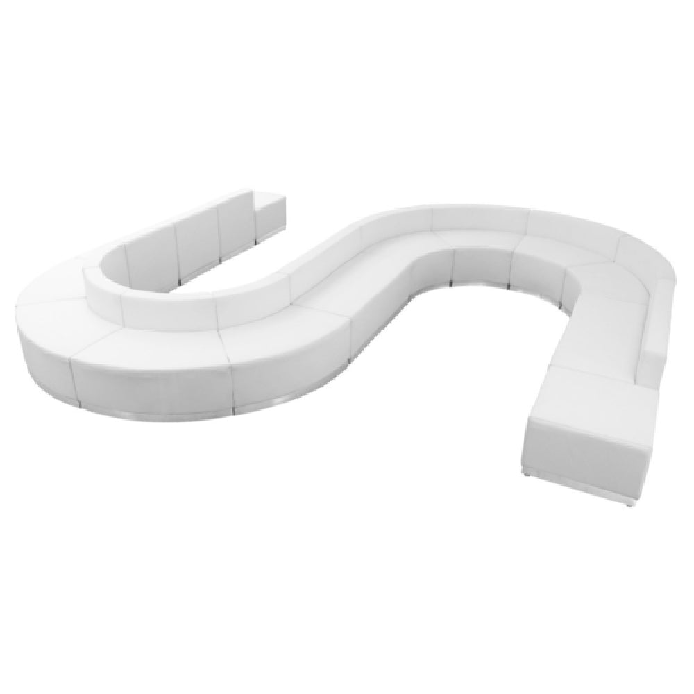 The Flash Furniture ZB-803-460-SET-WH-GG Hercules Alon Series Reception Configuration is a versatile modular seating arrangement designed to enhance any reception area with its elegant design and practical features. The configuration spans an impressive 184-1/2 inches in width, with depths ranging from 25-1/4 to 155 inches, and a height of 27 inches. Included in this set are three chairs measuring 25-1/2 inches in width, four concave chairs with adjustable widths from 21-1/2 to 41-1/2 inches, four convex chairs with widths varying from 41-1/2 to 21-1/2 inches, two loveseats each 51 inches wide, and two ottomans with dimensions of 25-1/2 inches by 25-1/4 inches with a height of 16 inches. Featuring LeatherSoft upholstery, which combines leather and polyurethane for added softness and durability, the seating offers a taut seat and back with line stitching throughout. Built with a brushed stainless steel base and equipped with adjustable floor glides, this configuration is both sturdy and adaptable to various flooring surfaces. Safety is prioritized with CA117 fire retardant foam, and the modular units are connected securely using a locking bolt system. This entire set is shipped in 15 boxes and typically ships within 24 hours, requiring assembly upon delivery.