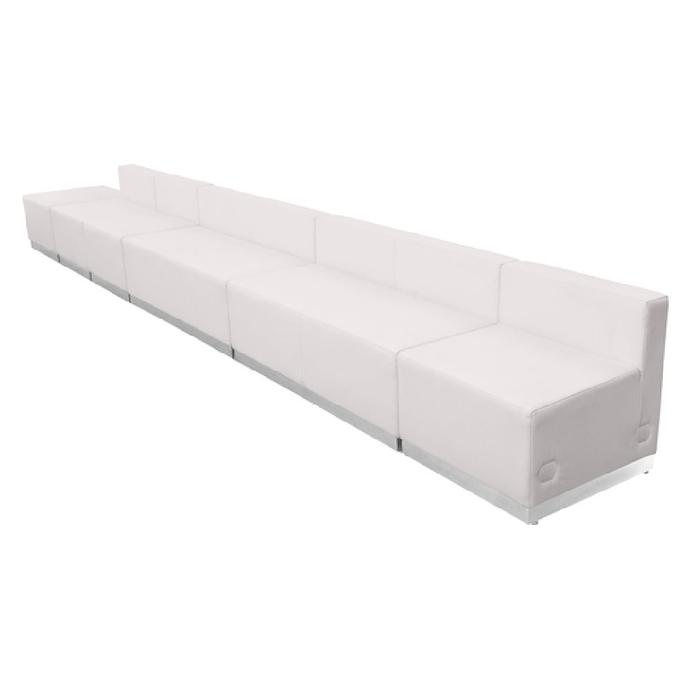 The Flash Furniture ZB-803-490-SET-WH-GG Hercules Alon Series Reception Configuration is a versatile and modular seating solution designed for modern reception and waiting areas. The entire setup spans 204-1/2"W, with varying depths from 25-1/4" to 25-1/2" and stands at a height of 27". This configuration includes three chairs each measuring 25-1/2"W x 25-1/4"D x 27"H, two loveseats at 51"W x 25-1/4"D x 27"H, and an ottoman sized at 25-1/2" x 25-1/4"D x 16"H. Upholstered in LeatherSoft, a blend of leather and polyurethane, the set offers durability and comfort with its taut seat and back finished with line stitching. Safety and stability are ensured with CA117 fire retardant foam and a brushed stainless steel base, alongside locking bolts that secure the chairs. The addition of adjustable floor glides aids in maintaining balance on uneven floors. Available in a sleek white finish, this set requires assembly and ships in six boxes, with in-stock items typically shipping within 24 hours. Ideal for professional environments, it combines aesthetic appeal with functional design, catering to diverse market needs within the reception furniture industry.