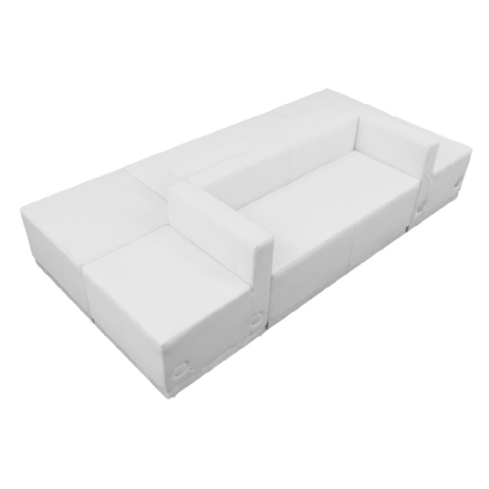 The Flash Furniture ZB-803-500-SET-WH-GG Hercules Alon Series Reception Configuration is a versatile and modular seating solution, ideal for various commercial settings like office receptions, lounges, and waiting areas. This configuration includes two chairs sized at 25-1/2"W x 25-1/4"D x 27"H, two loveseats measuring 51"W x 25-1/4"D x 27"H, and two ottomans at 25-1/2"W x 25-1/4"D x 16"H. The LeatherSoft upholstery, a blend of leather and polyurethane, ensures a soft, durable surface with taut seat and back, accentuated by line stitching throughout for a sleek appearance. Safety is a priority with CA117 fire retardant foam, and the pieces connect securely using locking bolts. The brushed stainless steel base adds modern elegance, supported by adjustable floor glides for stability on any surface. This setup, shipped in six boxes, requires assembly and is designed to fit seamlessly into dynamic environments where adaptability and style are paramount. Available in white, items typically ship within 24 hours if in stock, providing a quick solution for immediate furnishing needs. This reception configuration combines practicality with stylish design, catering to diverse market needs in the furniture industry.