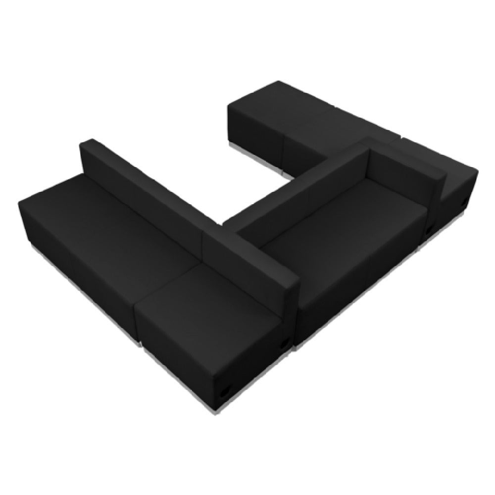 The Flash Furniture ZB-803-510-SET-BK-GG Hercules Alon Series Reception Configuration is a versatile modular seating solution designed for diverse environments such as office reception areas, lounges, and waiting rooms. The configuration includes components with precise dimensions: two chairs measuring 25-1/2"W x 25-1/4"D x 27"H, two loveseats at 51"W x 25-1/4"D x 27"H, and two ottomans sized at 25-1/2"W x 25-1/4"D x 16"H. Crafted with LeatherSoft upholstery, this series ensures comfort and durability with its taut seat and back, complemented by line stitching throughout. The inclusion of CA117 fire retardant foam enhances safety, while the brushed stainless steel base adds a modern touch. The locking bolt feature securely connects chairs for stable configurations, and adjustable floor glides provide balance on uneven surfaces. This product arrives in six boxes and typically ships within 24 hours, ready to be assembled. The Hercules Alon Series is distinguished by its adaptability, making it suitable for various market segments, offering a blend of functionality and style in professional settings.