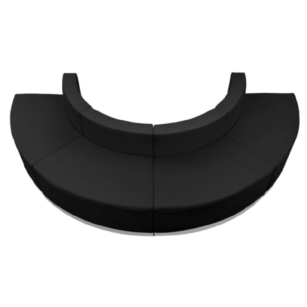 The Flash Furniture ZB-803-520-SET-BK-GG Hercules Alon Series Reception Configuration is a versatile modular seating solution, meticulously designed for modern reception spaces. With overall dimensions of 105 inches wide, 25-1/4 inches to 52-1/2 inches deep, and 27 inches high, this set includes four convex chairs, each measuring 41-1/2 inches to 21-1/2 inches wide, 25-1/4 inches deep, and 27 inches high. These chairs are crafted with LeatherSoft upholstery, providing a smooth, durable surface that combines leather and polyurethane for added softness and strength. The seating features taut seat and back construction, enhanced by line stitching throughout, ensuring both style and durability. Safety and stability are prioritized with CA117 fire retardant foam and a unique locking bolt system that securely connects the chairs. The brushed stainless steel base adds a sleek, modern aesthetic, while adjustable floor glides ensure the seating remains stable on uneven surfaces. Available in a classic black finish, the set requires assembly and is conveniently shipped in four boxes. Generally, in-stock items typically ship within 24 hours, making this reception configuration an efficient choice for businesses seeking both immediate and long-term seating solutions in their professional environments.