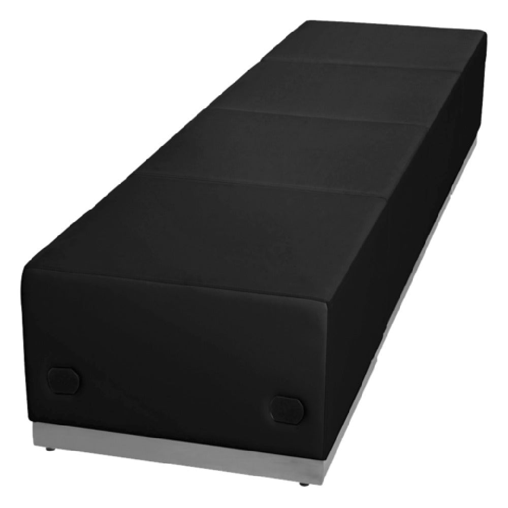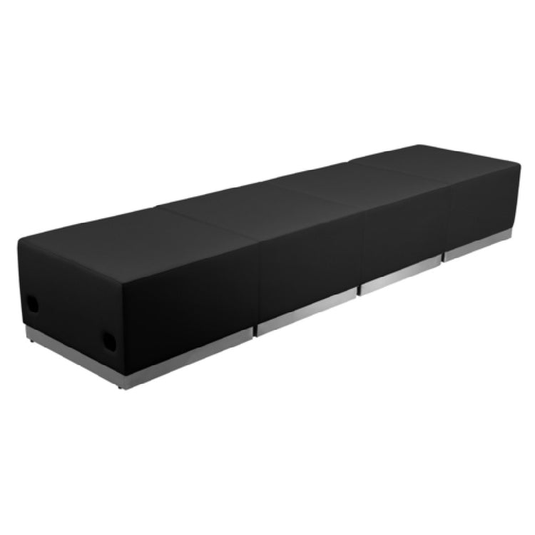 The Flash Furniture ZB-803-540-SET-BK-GG Hercules Alon Series Reception Configuration is a modular seating solution renowned for its versatility and contemporary aesthetics. Measuring an overall dimension of 102"W x 25-1/4" to 25-1/2"D x 16"H, this product comprises four individual 25-1/2"W x 25-1/4"D x 16"H ottomans. Each piece features LeatherSoft upholstery, a combination of leather and polyurethane, ensuring a soft and durable seating experience. The taut seat and back are adorned with meticulous line stitching, enhancing both style and resilience. Integrated with CA117 fire retardant foam, the configuration prioritizes safety without compromising comfort. Its modular nature allows for various setup configurations, suitable for diverse environments from corporate reception areas to personal living spaces. The ottomans are securely connected using locking bolts, and a brushed stainless steel base adds an element of modern sophistication. Adjustable floor glides help maintain stability on uneven surfaces. Available in a sleek black finish, this reception configuration is designed for ease of assembly, shipped in four boxes, and typically dispatched within 24 hours, making it a practical choice for those seeking prompt delivery and immediate use.