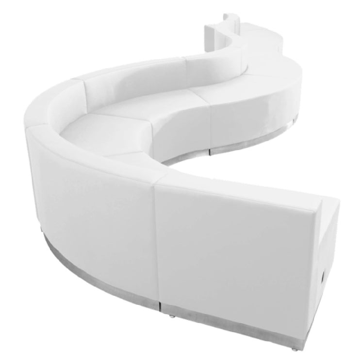 The Flash Furniture ZB-803-560-SET-WH-GG Hercules Alon Series Reception Configuration is a sophisticated seating solution designed for modern reception areas. This versatile configuration spans 236"W x 25-1/4" to 74"D x 27"H in overall dimensions, making it an ideal choice for large spaces seeking contemporary aesthetics. The set includes one 25-1/2"W x 25-1/4"D x 27"H chair, four concave chairs ranging from 21-1/2" to 41-1/2"W x 25-1/4"D x 27"H, and three convex chairs sized from 41-1/2" to 21-1/2"W x 25-1/4"D x 27"H, providing flexible seating arrangements. Additionally, it features a 25-1/2" x 25-1/4"D x 16"H ottoman for added comfort. Upholstered in LeatherSoft, a blend of leather and polyurethane, this set offers durability and a soft touch. The taut seat and back, along with line stitching throughout, enhance its sleek appearance. Safety features include CA117 fire retardant foam and a locking bolt mechanism to secure the chairs in place. Supported by a brushed stainless steel base and equipped with adjustable floor glides, this set is both stable and stylish. Shipped in nine boxes, in-stock items typically ship within 24 hours, ensuring efficient delivery and setup.