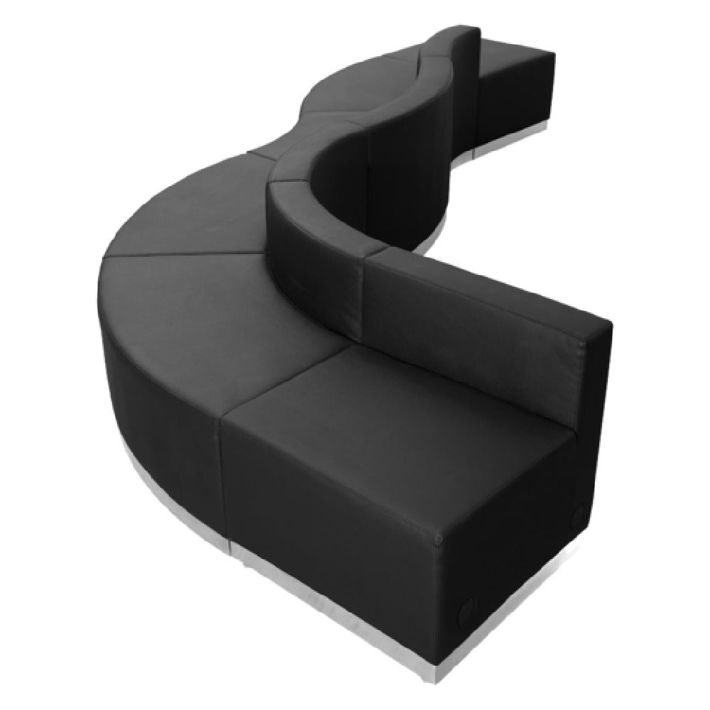 The Flash Furniture ZB-803-580-SET-BK-GG Hercules Alon Series Reception Configuration is a versatile modular seating solution designed to optimize any reception area with style and functionality. With overall dimensions of 162-1/2"W x 25-1/4" to 66"D x 27"H, this configuration includes a selection of seating options: a 25-1/2"W x 25-1/4"D x 27"H chair, a 21-1/2" to 41-1/2"W x 25-1/4"D x 27"H concave chair, and three 41-1/2" to 21-1/2"W x 25-1/4"D x 27"H convex chairs, providing diverse arrangement possibilities. Additionally, a 25-1/2" x 25-1/4"D x 16"H ottoman complements the setup. Upholstered in LeatherSoft, a blend of leather and polyurethane, it offers both comfort and durability. The taut seat and back feature line stitching throughout, enhancing the sleek aesthetic. Safety and stability are prioritized with CA117 fire retardant foam and a brushed stainless steel base, while adjustable floor glides ensure an even seating surface. Each piece connects via locking bolts, allowing for secure configurations. The set ships in six boxes and is typically dispatched within 24 hours, ensuring prompt availability for various segments of the hospitality and business industry seeking reliable and stylish reception area furnishings.