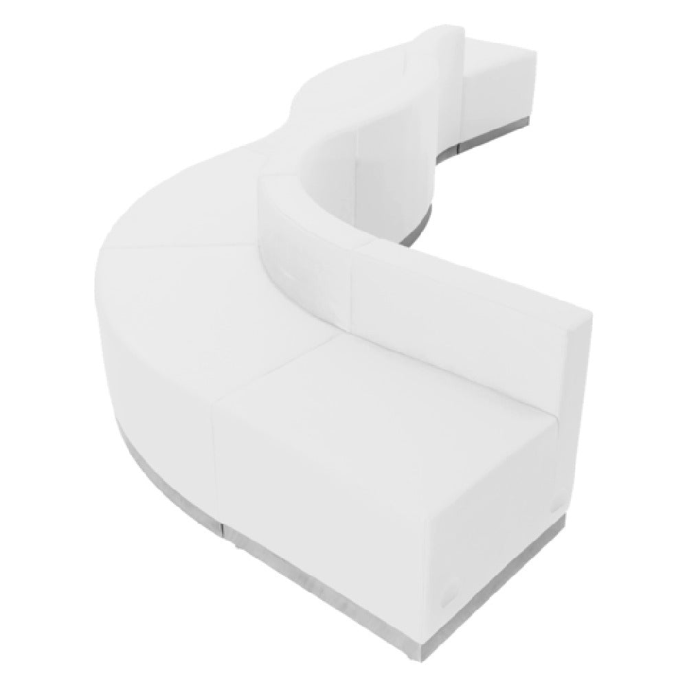 The Flash Furniture ZB-803-580-SET-WH-GG Hercules Alon Series Reception Configuration is a meticulously designed modular seating solution ideal for various market segments such as corporate offices, hotels, and event venues. Measuring 162-1/2"W x 25-1/4" to 66"D x 27"H in overall dimensions, this versatile configuration includes multiple seating components: a 25-1/2"W x 25-1/4"D x 27"H chair, a 21-1/2" to 41-1/2"W x 25-1/4"D x 27"H concave chair, and three 41-1/2" to 21-1/2"W x 25-1/4"D x 27"H convex chairs, along with a 25-1/2" x 25-1/4"D x 16"H ottoman. The LeatherSoft upholstery combines leather and polyurethane for added softness and durability. The taut seat and back are accentuated by line stitching throughout, ensuring both style and comfort. Fire safety is a key consideration, with CA117 fire retardant foam incorporated. The chairs are connected securely with a locking bolt, and the brushed stainless steel base adds stability and elegance. For adaptability, adjustable floor glides are provided, enhancing functionality across different floor surfaces. The configuration comes in a sleek white color, with assembly required and items shipped in six boxes. This product is typically shipped within 24 hours when in stock, highlighting its availability and convenience.