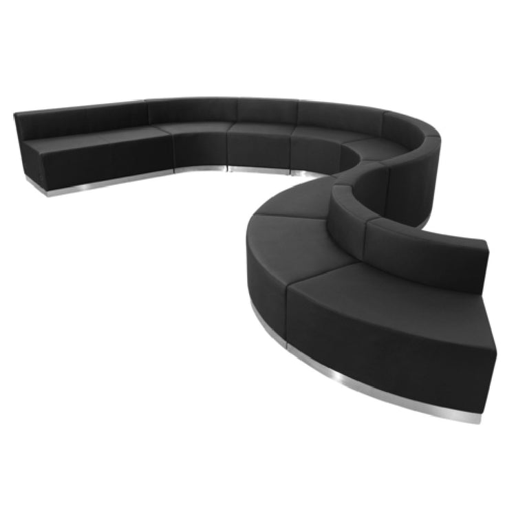 The Flash Furniture ZB-803-600-SET-BK-GG Hercules Alon Series Reception Configuration is a versatile seating solution designed to enhance reception and lounge areas with its modular design and premium features. This configuration spans 187 inches in width, with depths ranging from 25-1/4 inches to 121-1/2 inches, and stands 27 inches high. Comprising nine distinct seating units, it includes a 25-1/2-inch wide chair, four concave chairs measuring 21-1/2 to 41-1/2 inches in width, three convex chairs ranging from 41-1/2 to 21-1/2 inches wide, and a 51-inch wide loveseat. Upholstered with LeatherSoft, the seats feature taut cushioning and line stitching, ensuring both comfort and durability. CA117 fire retardant foam adds an extra layer of safety. The pieces are securely connected with locking bolts, while a brushed stainless steel base and adjustable floor glides provide stability. Shipped in nine boxes, the set is available in black and requires assembly. Typically, in-stock items dispatch within 24 hours. This reception configuration is ideal for commercial environments looking to balance style, flexibility, and safety in their seating arrangements.