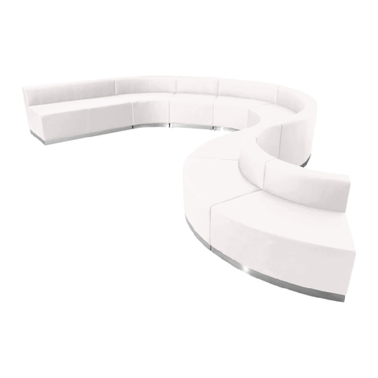 The Flash Furniture ZB-803-600-SET-WH-GG Hercules Alon Series Reception Configuration is an exceptionally adaptable and stylish seating solution designed for modern reception areas. With overall dimensions of 187"W x 25-1/4" to 121-1/2"D x 27"H, this modular set includes: one chair measuring 25-1/2"W x 25-1/4"D x 27"H, four concave chairs with widths ranging from 21-1/2" to 41-1/2", three convex chairs with widths from 41-1/2" to 21-1/2", and a loveseat at 51"W x 25-1/4"D x 27"H. The seating arrangement is upholstered in LeatherSoft, a blend that combines leather and polyurethane for added softness and durability, while featuring taut seat and back with line stitching for a sleek appearance. Safety and compliance are ensured with CA117 fire retardant foam. The chairs are connected with locking bolts for stability, supported by a brushed stainless steel base and adjustable floor glides for leveling on various surfaces. Delivered in nine boxes, the set requires assembly, with in-stock items typically shipping within 24 hours. This configuration provides a sophisticated and functional seating space, suitable for various commercial settings seeking a balance of aesthetics and practicality.