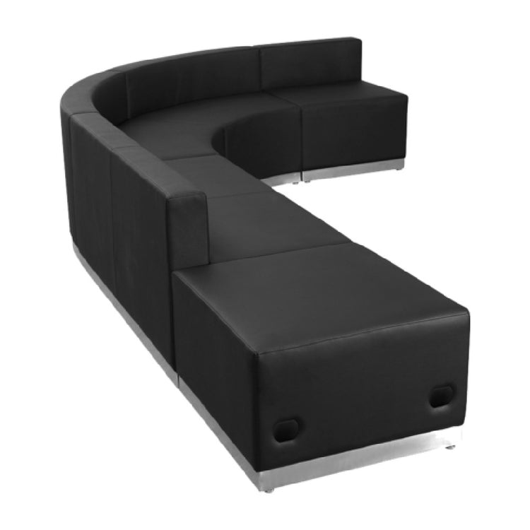 The Flash Furniture ZB-803-610-SET-BK-GG Hercules Alon Series Reception Configuration is a versatile modular seating solution designed to enhance any reception area with its high-quality features and sleek design. This configuration includes an array of seating options: one chair measuring 25-1/2"W x 25-1/4"D x 27"H, two concave chairs adjustable from 21-1/2" to 41-1/2"W x 25-1/4"D x 27"H, one loveseat at 51"W x 25-1/4"D x 27"H, and a 25-1/2" x 25-1/4"D x 16"H ottoman. Its LeatherSoft upholstery provides a comfort-enhanced experience with taut seat and back support, accentuated by line stitching throughout for a stylish finish. The set is equipped with CA117 fire retardant foam for added safety and a brushed stainless steel base, ensuring durability and modern appeal. Locking bolts connect the chairs securely, and adjustable floor glides allow for stability on uneven surfaces. The configuration ships in five boxes, with in-stock items typically shipping within 24 hours, making it a convenient choice for businesses seeking to optimize their reception spaces efficiently. This collection is particularly beneficial for offices, healthcare facilities, and corporate settings looking to combine functionality with sophisticated aesthetic appeal. Assembly is required.