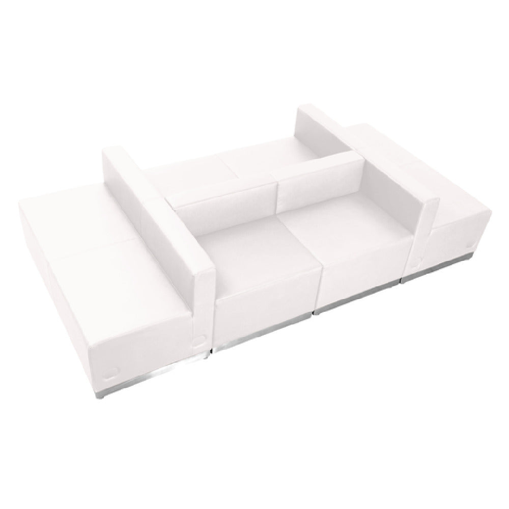 The Flash Furniture ZB-803-650-SET-WH-GG Hercules Alon Series Reception Configuration exemplifies a modular furniture solution designed for sophisticated reception areas. With overall dimensions of 102-1/2"W x 25-1/4" to 51"D x 27"H, this set includes a combination of seating elements: two chairs measuring 25-1/2"W x 25-1/4"D x 27"H, two loveseats at 51"W x 25-1/4"D x 27"H, and two ottomans sized at 25-1/2" x 25-1/4"D x 16"H. Its modularity offers versatility for various spatial configurations. Upholstered in LeatherSoft, a blend of leather and polyurethane, it ensures both comfort and durability. The design features taut seat and back with line stitching throughout, enhancing its aesthetic appeal. Safety is prioritized with CA117 fire retardant foam, and stability is assured with a brushed stainless steel base and adjustable floor glides. The locking bolt mechanism allows secure connectivity between chairs. Available in pristine white, this set requires assembly and is shipped in six boxes. Typically in stock items are dispatched within 24 hours, making it a convenient choice for businesses seeking a quick, stylish upgrade to their reception areas.
