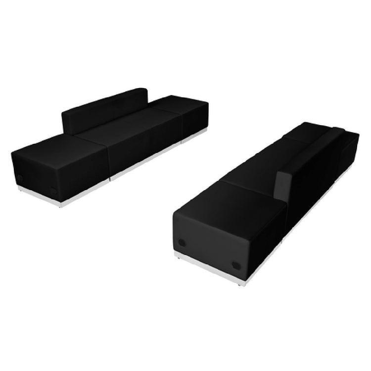 The Flash Furniture ZB-803-700-SET-BK-GG Hercules Alon Series Reception Configuration is a versatile modular seating solution, measuring an expansive 102-1/2"W x 25-1/4" to 25-1/2"D x 27"H in overall dimensions. This set features two 51"W x 25-1/4"D x 27"H loveseats and four 25-1/2"W x 25-1/4"D x 16"H ottomans, offering adaptable functionality for various reception and lounge environments. The product's LeatherSoft upholstery combines durability with comfort, complemented by a taut seat and back with line stitching throughout for a sleek aesthetic. Safety and durability are prioritized with CA117 fire retardant foam and a brushed stainless steel base. The locking bolt system ensures secure configuration, while adjustable floor glides enable stability on uneven surfaces. Shipped in six boxes, this set requires assembly and is typically dispatched within 24 hours for in-stock items. The Hercules Alon Series is ideally suited for business lobbies, waiting rooms, and other professional settings, providing a sophisticated seating arrangement that blends seamlessly into modern decor while accommodating diverse spatial needs.