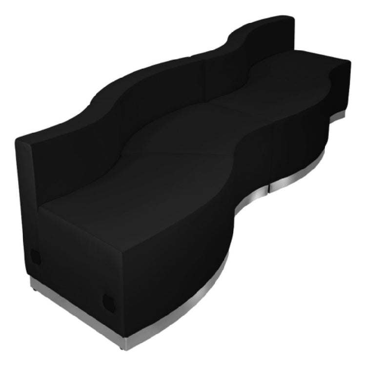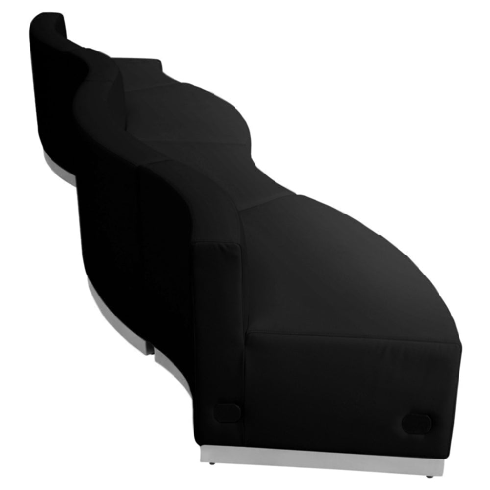 The Flash Furniture ZB-803-730-SET-BK-GG Hercules Alon Series Reception Configuration is a versatile and modular seating solution designed to meet the needs of various reception and lounge areas. With overall dimensions of 131-1/2"W x 25-1/4" to 31-1/2"D x 27"H, this set includes two concave chairs measuring 21-1/2" to 41-1/2"W x 25-1/4"D x 27"H and two convex chairs measuring 41-1/2" to 21-1/2"W x 25-1/4"D x 27"H. The LeatherSoft upholstery offers a comfortable and durable seating experience, while the taut seat and back, complemented by line stitching throughout, provide a sleek and professional appearance. The CA117 fire retardant foam ensures safety, while the chairs are securely connected with a locking bolt mechanism. A brushed stainless steel base adds to the aesthetic appeal and stability, and adjustable floor glides facilitate a level installation on various surfaces. This set is shipped in four boxes with assembly required and is typically in stock for shipment within 24 hours. Ideal for office reception areas, waiting rooms, and lounges, the Hercules Alon Series offers a sophisticated and functional seating solution, tailored to enhance any professional environment.