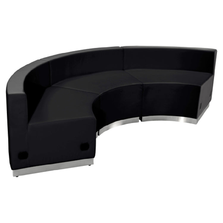 The Flash Furniture ZB-803-740-SET-BK-GG Hercules Alon Series Leather Configuration is a versatile modular seating solution designed for various professional environments. With overall dimensions of 97 inches wide by 25-1/4 to 42 inches deep and 27 inches high, this configuration is composed of three concave chairs, each measuring 21-1/2 to 41-1/2 inches wide by 25-1/4 inches deep and 27 inches high. The chairs are upholstered in LeatherSoft, combining leather and polyurethane for added comfort and durability. This seating arrangement features taut seat and back surfaces with line stitching throughout for a modern aesthetic. Equipped with CA117 fire retardant foam, it meets safety standards while maintaining comfort. The chairs are securely connected with a locking bolt system and rest on a brushed stainless steel base, adding to their stability and sleek appearance. Adjustable floor glides provide adaptability on various surfaces, making this product suitable for office spaces, waiting areas, and lounges. Available in black, it ships in three boxes and typically dispatches within 24 hours for in-stock items. Assembly is required, ensuring a tailored fit for different layouts and an integrated look in any setting.