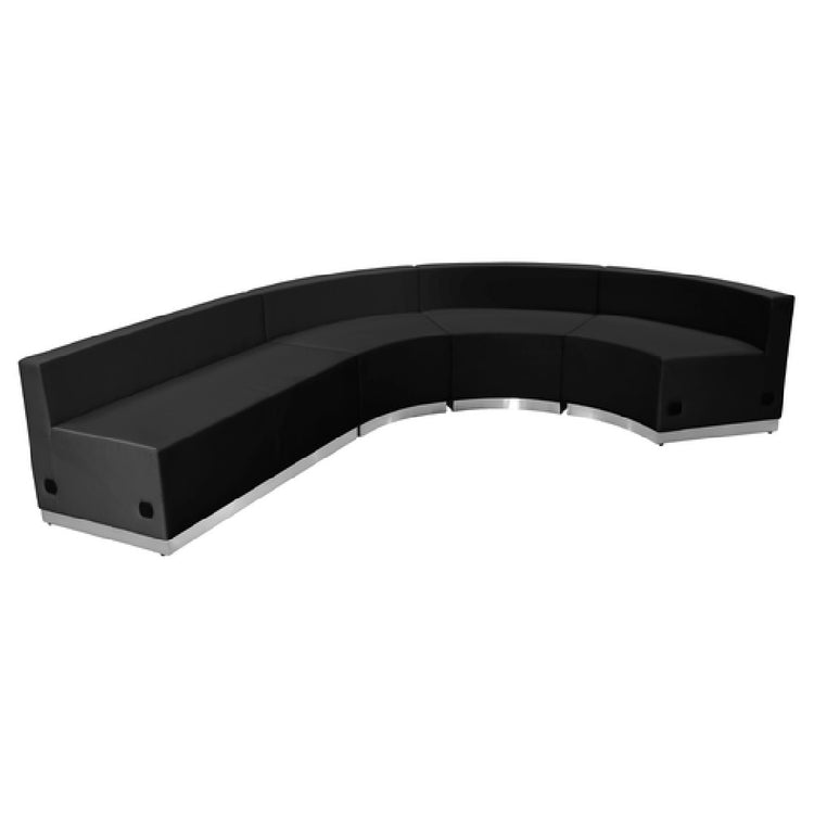 The Flash Furniture ZB-803-760-SET-BK-GG Hercules Alon Series Reception Configuration is a versatile modular seating solution that caters to a variety of reception and office environments. This configuration includes three concave chairs and one loveseat, with overall dimensions of 103-1/2 inches wide by 25-1/4 to 89-1/2 inches deep and 27 inches high. Each concave chair measures between 21-1/2 to 41-1/2 inches wide, while the loveseat is 51 inches wide by 25-1/4 inches deep and 27 inches high. The chairs are connected with locking bolts, ensuring stability and flexibility in arrangement. Upholstered in LeatherSoft, a combination of leather and polyurethane, this seating solution offers both durability and comfort with its taut seat and back. The line stitching enhances the aesthetic appeal, while CA117 fire retardant foam ensures safety. A brushed stainless steel base adds a touch of elegance, and adjustable floor glides provide stability on uneven surfaces. The configuration is available in black and requires assembly, which is facilitated by its shipment in four boxes. With in-stock items typically shipping within 24 hours, this reception configuration is an efficient and stylish choice for enhancing any professional space.