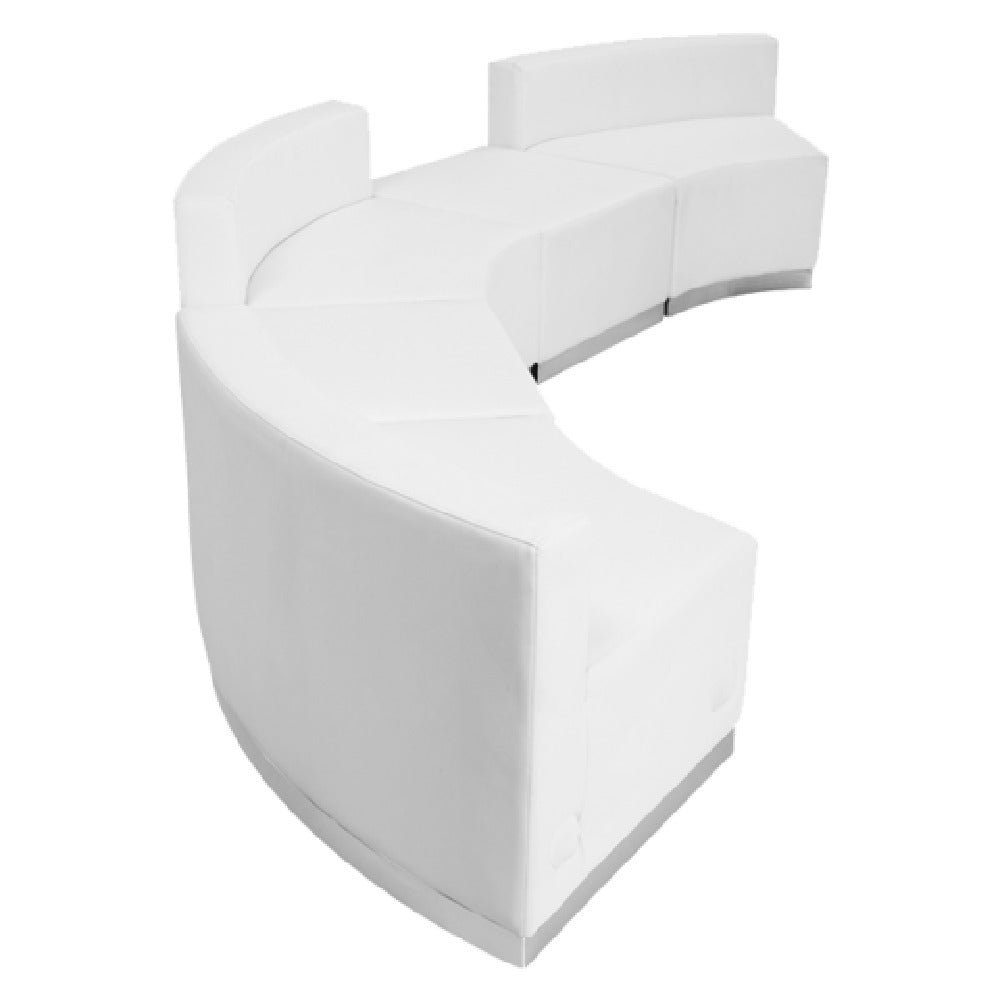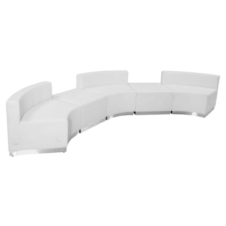 The Flash Furniture ZB-803-810-SET-WH-GG Hercules Alon Series Reception Configuration is a versatile modular seating solution designed for contemporary reception areas. With overall dimensions of 144"W x 25-1/4" to 52"D x 27"H, it offers flexibility and adaptability for various space requirements. This configuration includes three concave chairs, each ranging from 21-1/2" to 41-1/2"W x 25-1/4"D x 27"H, and two ottomans measuring 25-1/2"W x 25-1/4"D x 16"H, allowing for customizable seating arrangements. The use of LeatherSoft upholstery provides a blend of leather and polyurethane for added softness and durability, while taut seat and back with line stitching throughout enhance its modern aesthetic. Safety is prioritized with CA117 fire retardant foam, and stability is ensured with locking bolts connecting the chairs. A brushed stainless steel base provides a sleek foundation, complemented by adjustable floor glides for leveling on various surfaces. Presented in a pristine white color, this reception configuration requires assembly and ships in five boxes, typically within 24 hours if in stock. The Flash Furniture Hercules Alon Series is ideal for businesses aiming to combine style, comfort, and functionality in their reception spaces.