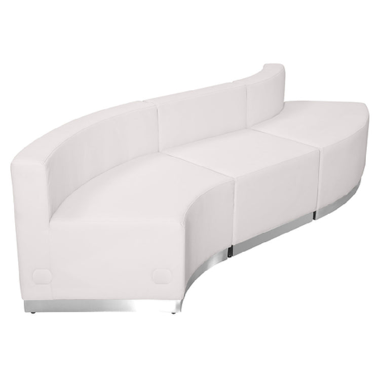 The Flash Furniture ZB-803-830-SET-WH-GG Hercules Alon Series Reception Configuration is a modular seating solution designed to enhance any reception area with its sleek and contemporary style. This versatile set includes a 25-1/2"W x 25-1/4"D x 27"H chair, a 21-1/2" to 41-1/2"W x 25-1/4"D x 27"H concave chair, and a 25-1/2" x 25-1/4"D x 16"H ottoman. The LeatherSoft upholstery provides a luxurious yet durable finish, ideal for high-traffic environments. The set features a taut seat and back with line stitching throughout, offering both aesthetic appeal and lasting comfort. Each piece is built with CA117 fire retardant foam for safety and a brushed stainless steel base for stability. The modular design allows for flexible configurations to suit various spatial requirements, while the locking bolt system securely connects the chairs. Adjustable floor glides ensure stability on uneven surfaces. Delivered in three boxes with assembly required, this reception configuration is typically ready to ship within 24 hours, ensuring quick delivery for businesses in need of an immediate upgrade. Finished in white, this configuration blends seamlessly into diverse decor styles, making it a versatile choice for offices, hospitality venues, and other commercial settings.