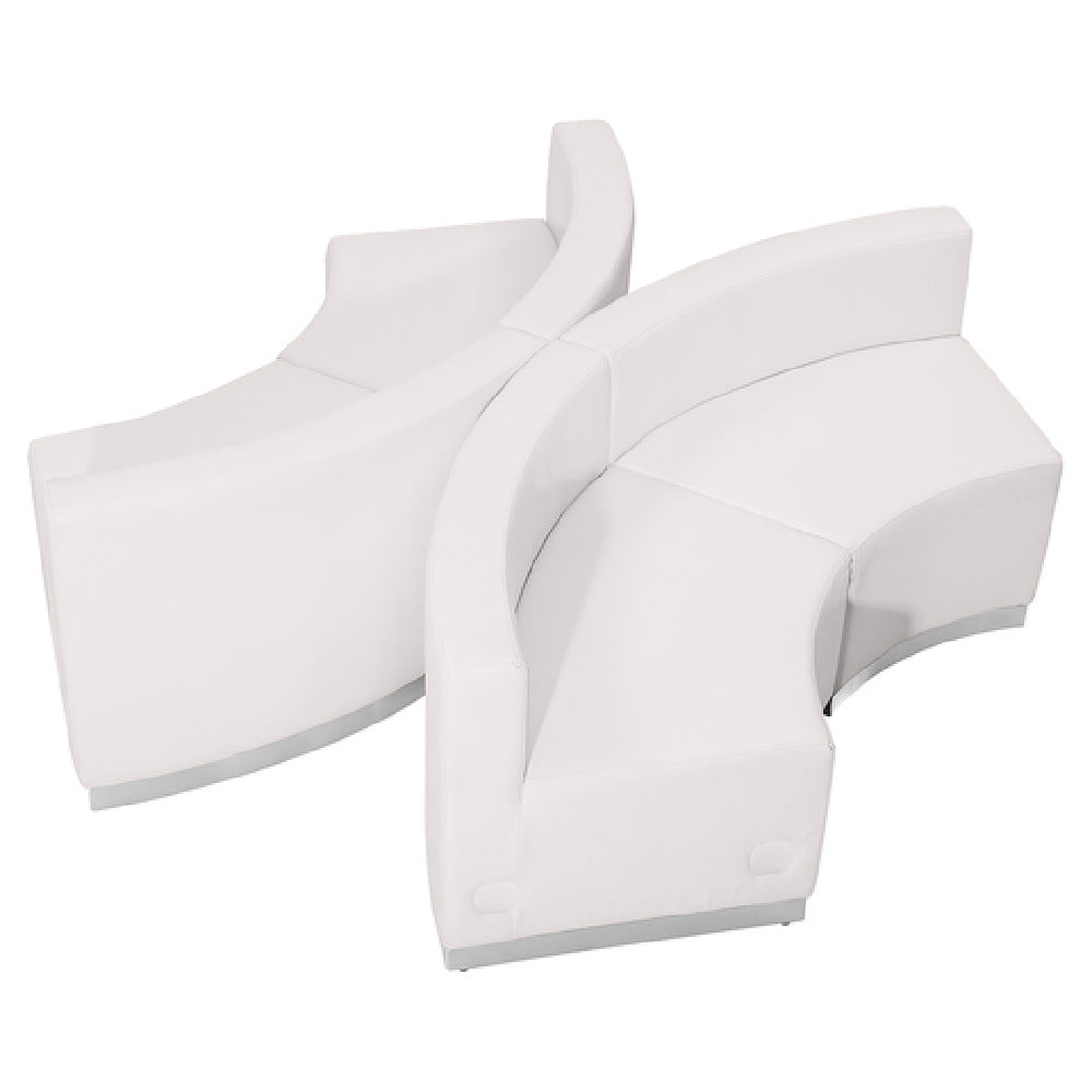 The Flash Furniture ZB-803-840-SET-WH-GG Hercules Alon Series Reception Configuration is a sophisticated modular seating solution that seamlessly combines style and functionality, ideal for modern reception areas. With overall dimensions of 74"W x 25-1/4" to 67"D x 27"H, this set includes four concave chairs each measuring 21-1/2" to 41-1/2"W x 25-1/4"D x 27"H. These chairs are upholstered in LeatherSoft, a luxurious combination of leather and polyurethane, which provides durability and softness. The set features taut seat and back with line stitching throughout, enhancing its sleek appearance. Safety and comfort are prioritized with CA117 fire retardant foam, while the brushed stainless steel base offers stability and a contemporary aesthetic. For versatile usage, the locking bolt connects the chairs, allowing multiple configurations to suit various space requirements. Adjustable floor glides ensure stability on uneven surfaces. The pristine white finish complements a wide range of decors, making it an attractive choice for businesses aiming to create a welcoming environment. Assembly is required, and the set ships in four boxes, with in-stock items typically dispatched within 24 hours. This configuration is an excellent choice for businesses seeking a flexible, stylish, and safe seating arrangement.