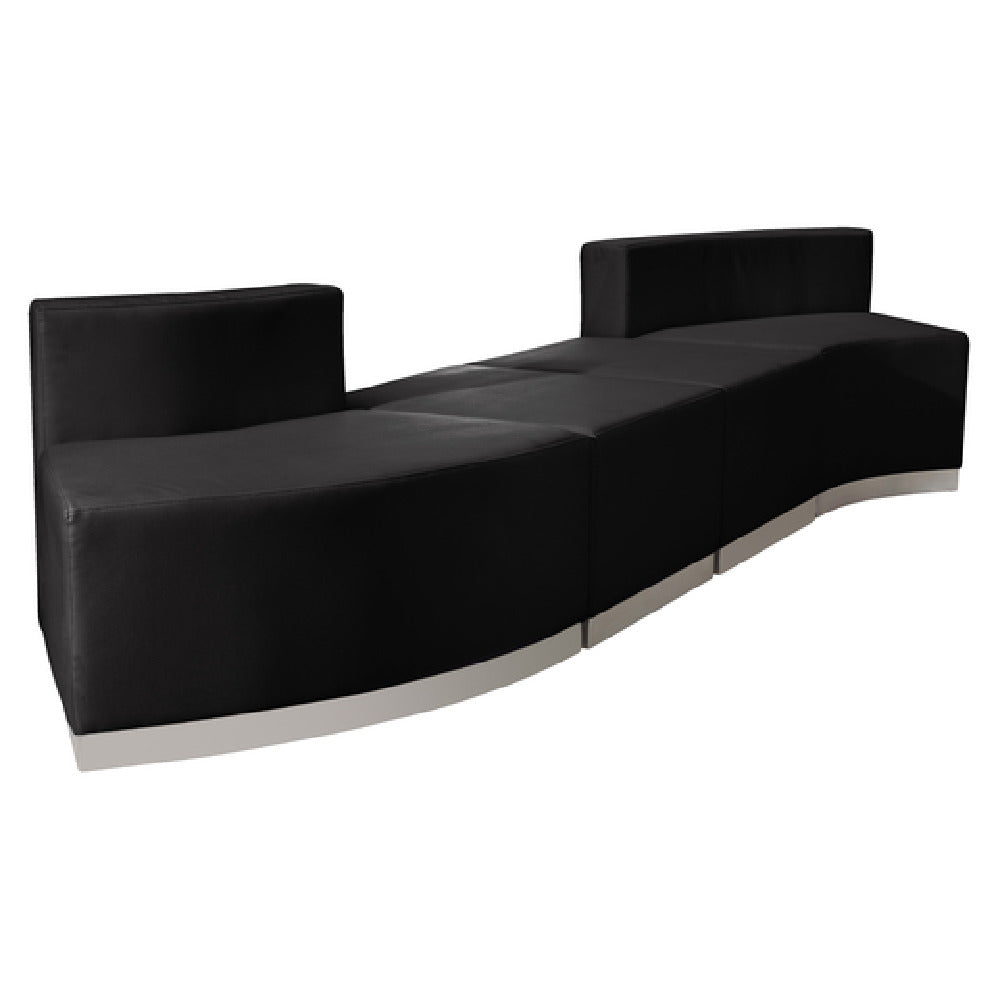 The Flash Furniture ZB-803-860-SET-BK-GG Hercules Alon Series Reception Configuration is a sophisticated modular seating solution designed to enhance any reception area with its sleek and functional style. This versatile set includes a concave chair measuring 21-1/2" to 41-1/2"W x 25-1/4"D x 27"H, a convex chair measuring 41-1/2" to 21-1/2"W x 25-1/4"D x 27"H, and a 25-1/2" x 25-1/4"D x 16"H ottoman. The entire configuration spans 100"W x 25-1/4" to 41-1/2"D x 27"H in overall dimensions. Upholstered in LeatherSoft, a combination of leather and polyurethane for added softness and durability, this reception set features taut seat and back with line stitching for a modern look. The CA117 fire retardant foam ensures safety, while the brushed stainless steel base provides sturdy support. Adjustable floor glides allow for easy leveling on uneven surfaces. The modular design means each piece can be locked together using the provided locking bolts, allowing for custom arrangements. Shipped in four boxes, assembly is required, and in-stock items typically ship within 24 hours. This reception configuration is ideal for offices, clinics, and waiting areas, offering both aesthetic appeal and functional seating solutions.