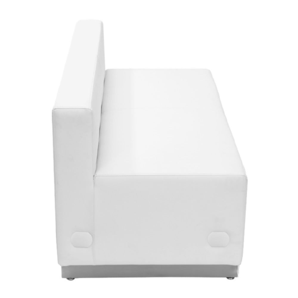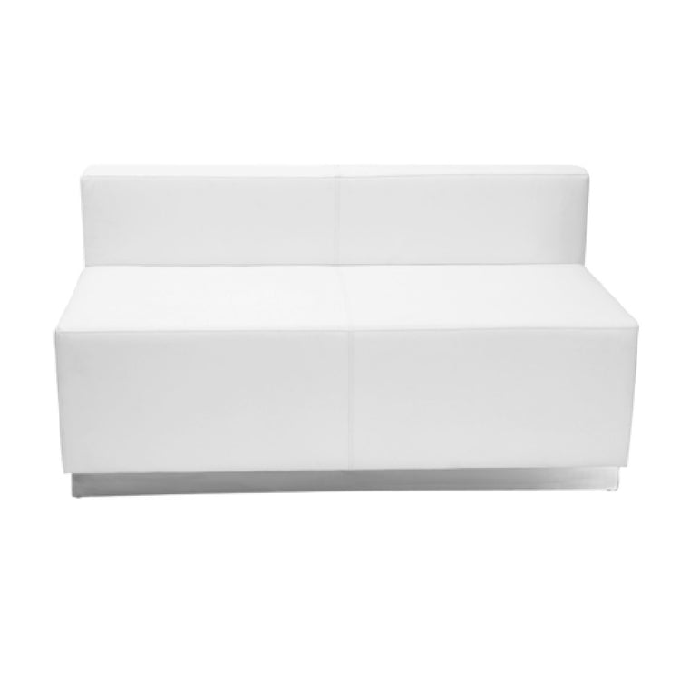 The Flash Furniture ZB-803-LS-WH-GG Hercules Alon Series Loveseat is a meticulously crafted seating solution measuring 51"W x 25-1/4"D x 27"H, designed to cater to diverse market segments with its blend of style, functionality, and safety. This loveseat is upholstered in LeatherSoft, a material that combines leather and polyurethane for added softness and durability, making it suitable for both commercial and residential spaces. Its taut seat and back, complemented by line stitching throughout, provide a sleek and modern aesthetic. Safety is paramount, as evidenced by the inclusion of CA117 fire retardant foam, ensuring compliance with fire safety regulations. Its modular design, enhanced by locking bolts that connect chairs, offers flexible seating arrangements ideal for dynamic environments like offices or hospitality settings. The brushed stainless steel base not only adds a contemporary touch but also ensures stability and longevity, while adjustable floor glides provide ease of placement on various flooring surfaces. In a sophisticated white color, this loveseat typically ships within 24 hours when in stock, emphasizing convenience and quick delivery. The Flash Furniture ZB-803-LS-WH-GG Hercules Alon Series Loveseat is a versatile and reliable choice for those seeking modern design combined with practical features.