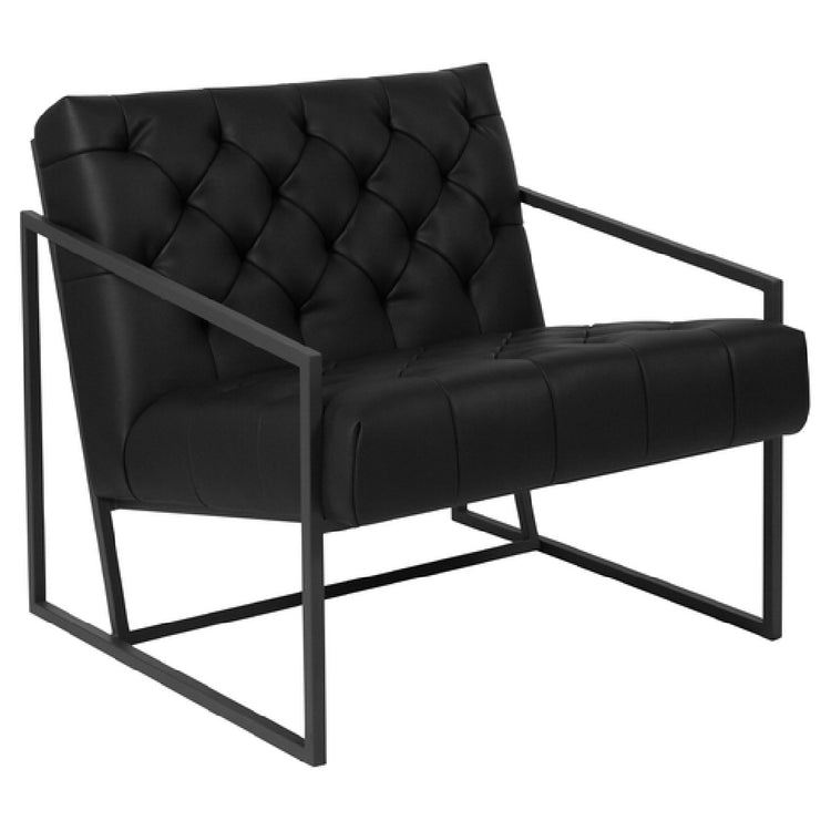 The Flash Furniture ZB-8522-BK-GG Hercules Madison Series Lounge Chair embodies a transitional design, perfectly blending classic and contemporary aesthetics to suit various environments. This lounge chair features LeatherSoft upholstery, a high-quality combination of leather and polyurethane, ensuring comfort and durability. The chair's tufted seat and back offer a sophisticated look, while the fixed seat and back cushions provide reliable support. Engineered with safety in mind, it complies with CA117 fire retardant standards, making it a secure choice for both residential and commercial spaces. The slanted arms add a touch of modern flair, while the dark gray powder-coated 1-inch tubular frame finish provides a sturdy and stylish base. To protect your flooring, this chair is equipped with plastic floor glides. Available in black, this chair is usually in stock and ships within 24 hours, making it a practical and stylish seating solution for office lounges, waiting rooms, or home interiors.