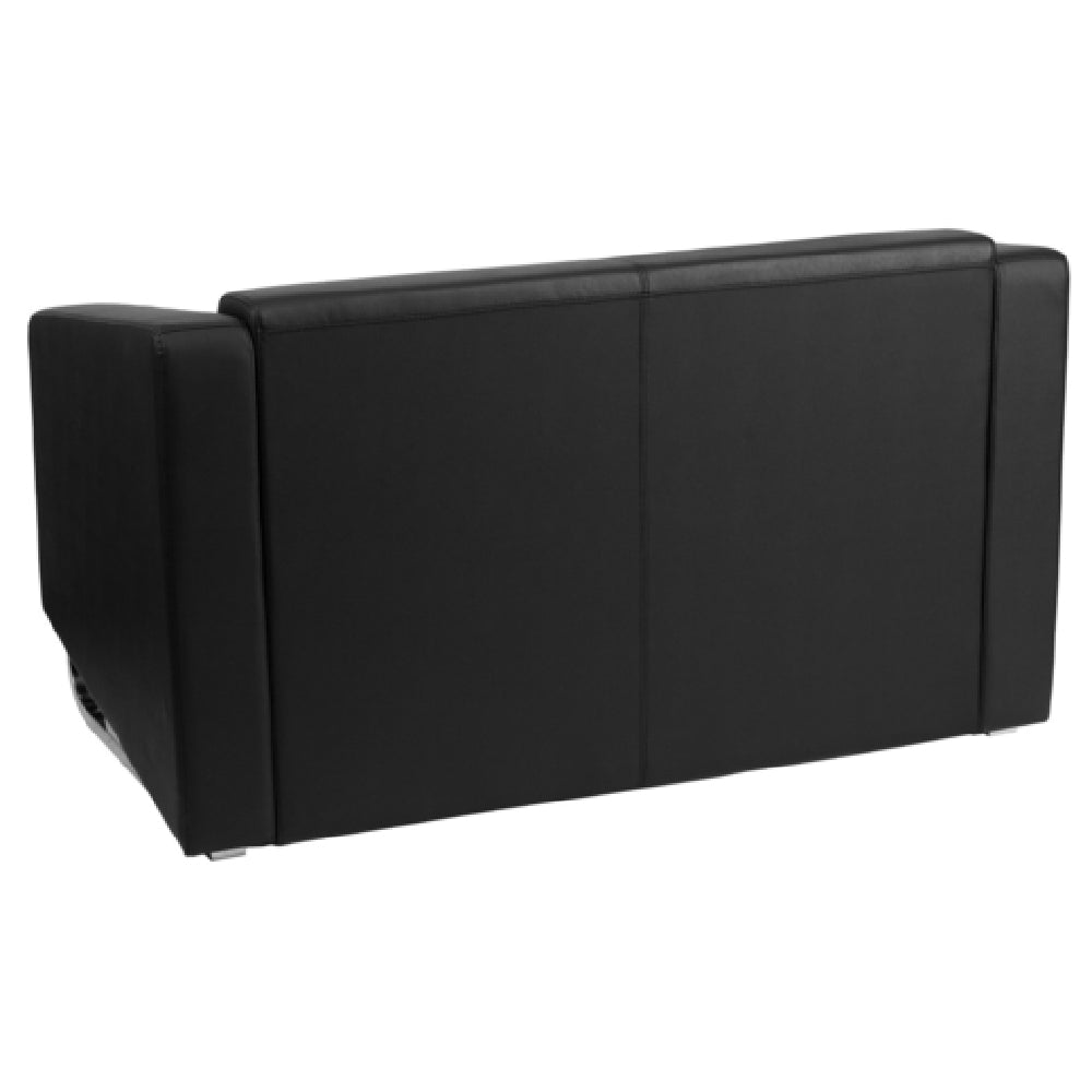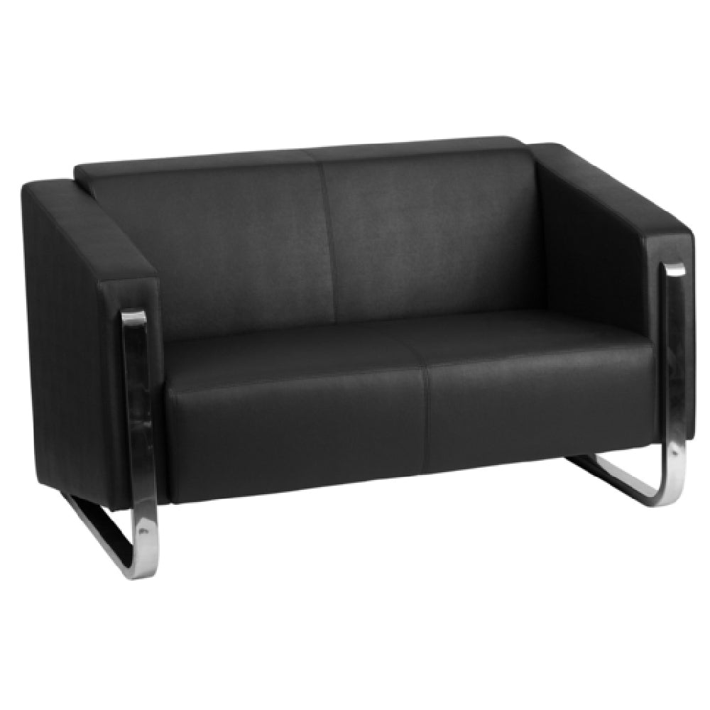 The Flash Furniture ZB-8803-2-LS-BK-GG Hercules Gallant Series Loveseat is a robust seating solution designed to cater to various market segments requiring comfort and durability. Measuring 54"W x 32-1/2"D x 30-1/2"H, this loveseat is crafted with LeatherSoft upholstery, providing a blend of leather and polyurethane for added softness and durability. The design features slanted arms and fixed seat cushions, contributing to a sleek and modern aesthetic. Inside, the loveseat includes CA117 fire retardant foam, ensuring safety and compliance with fire safety standards. The exposed curved stainless steel frame not only adds to its contemporary design but also offers sturdy support. This product is available in black and requires assembly. With items typically shipping within 24 hours, the loveseat is an efficient choice for commercial spaces such as offices, waiting areas, and lounges seeking both style and functionality. Its combination of premium materials and thoughtful design makes it a versatile option for businesses looking to enhance their interior décor while providing comfortable seating solutions.