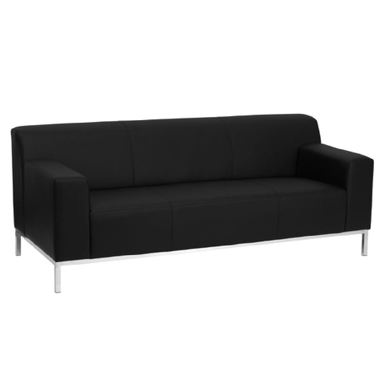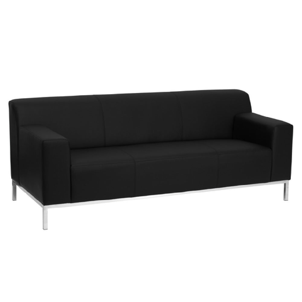 The Flash Furniture ZB-DEFINITY-8009-SOFA-BK-GG Hercules Definity Series Sofa is a meticulously designed seating solution measuring 75-1/4"W x 31"D x 29-1/4"H. Its LeatherSoft upholstery combines leather and polyurethane for added comfort and durability, while the straight arm design enhances a modern aesthetic. Featuring a fixed seat cushion and line stitching throughout, this sofa is constructed with CA117 fire retardant foam, ensuring safety and compliance with stringent standards. The integrated stainless steel legs and frame provide robust support and stability, making it suitable for various market segments, including residential, office, and hospitality settings. Available in classic black, this sofa requires assembly upon delivery, with in-stock items typically shipping within 24 hours. The blend of style, safety, and functionality makes the Flash Furniture Hercules Definity Series Sofa a versatile choice for diverse environments, emphasizing its adaptability and reliable construction.