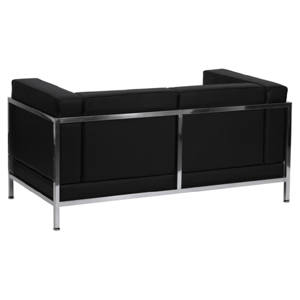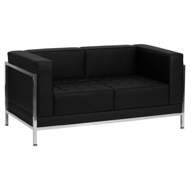 The Flash Furniture ZB-IMAG-LS-GG Hercules Imagination Series Loveseat stands out with its distinctive combination of style and function. Measuring 57 inches wide by 28-3/4 inches deep and 27-1/4 inches high, this loveseat is a modular piece, perfect for versatile seating arrangements in various settings. Its LeatherSoft upholstery—an exquisite blend of leather and polyurethane—ensures a soft, durable surface that is easy to maintain. The smooth back and tufted seat provide a sophisticated look while offering superior comfort. Built with fixed seat and back cushions, it guarantees long-lasting stability and support. The inclusion of CA117 fire retardant foam highlights its safety features, making it an ideal choice for public spaces. This loveseat also features an exposed stainless steel accent bar and integrated stainless steel legs, adding a modern touch to its design. The product requires assembly but promises ease and efficiency with in-stock items typically shipping within 24 hours. This loveseat caters to a variety of market segments, including office waiting areas and upscale residential spaces, offering both aesthetic appeal and functional benefits.