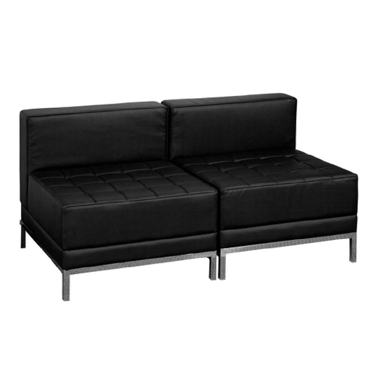 Flash Furniture ZB-IMAG-MIDCH-2-GG Hercules Imagination Series Lounge Set is an elegantly designed modular seating solution that caters to both commercial and residential environments. With overall dimensions of 56"W x 28-3/4"D x 27-1/4"H, this lounge set features two middle chairs, each measuring 28"W x 28-3/4"D x 27-1/4"H, making it adaptable for various spaces. The set is upholstered in LeatherSoft, a blend of leather and polyurethane, providing a soft and durable finish. The smooth back and tufted seat design, along with fixed seat and back cushions, contribute to a stylish and comfortable seating experience. Safety and durability are prioritized with CA117 fire retardant foam, ensuring compliance with fire safety standards. The design is enhanced by an exposed stainless steel accent bar and integrated stainless steel legs, offering a modern and sleek appearance. This set requires assembly and is shipped in two boxes, with in-stock items typically dispatched within 24 hours. The Flash Furniture ZB-IMAG-MIDCH-2-GG is an ideal choice for those seeking a versatile, stylish, and safe seating option for office lounges, waiting areas, or home living spaces.