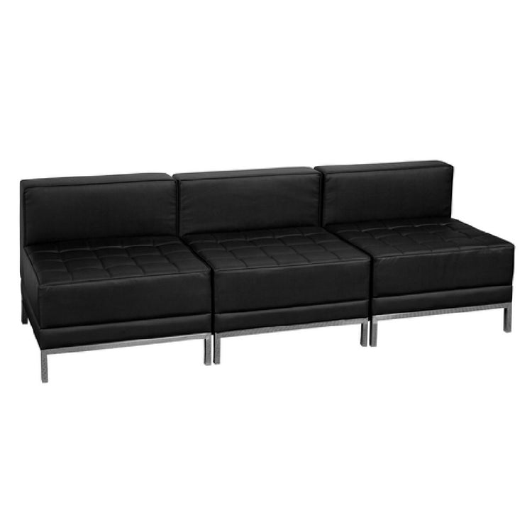 The Flash Furniture ZB-IMAG-MIDCH-3-GG Hercules Imagination Series Lounge Set is a premium modular seating arrangement designed to elevate any space with its contemporary style and versatile functionality. Measuring 84"W x 28-3/4"D x 27-1/4"H in overall dimensions, this set comprises three middle chairs, each 28"W x 28-3/4"D x 27-1/4"H, that can be configured to fit various layouts. The set features LeatherSoft upholstery, which combines leather and polyurethane for added softness and durability, offering a sophisticated touch to any environment. The smooth back and tufted seat design provide both comfort and aesthetic appeal, while the fixed seat and back cushions ensure stability. Constructed with CA117 fire retardant foam, this lounge set emphasizes safety without compromising on comfort. The exposed stainless steel accent bar and integrated stainless steel legs not only enhance the set’s modern look but also contribute to its structural integrity. Available in classic black, this lounge set is shipped in two boxes and usually dispatches within 24 hours of ordering. Ideal for offices, lobbies, or home settings, the Hercules Imagination Series Lounge Set brings a blend of style, comfort, and functionality to various segment markets within the furniture industry.
