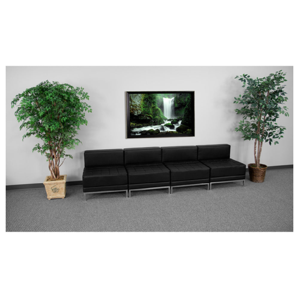 The Flash Furniture ZB-IMAG-MIDCH-4-GG Hercules Imagination Series Lounge Set is a modular seating solution that seamlessly integrates into various environments, offering flexibility and style. With overall dimensions of 112”W x 28-3/4”D x 27-1/4”H, this lounge set includes four middle chairs, each measuring 28”W x 28-3/4”D x 27-1/4”H. The set is constructed with LeatherSoft upholstery, known for its combined leather and polyurethane material that enhances both durability and comfort. The design features a smooth back and tufted seat, with fixed seat and back cushions made from CA117 fire retardant foam, providing safety and resilience. Accentuating its contemporary aesthetic are exposed stainless steel accent bars and integrated stainless steel legs, contributing to its structural integrity. The set is shipped in two boxes and requires assembly, with in-stock items typically dispatched within 24 hours. This versatile lounge set is ideal for commercial spaces like offices and waiting areas, as well as residential settings, delivering a sophisticated seating arrangement that caters to both aesthetics and functionality.