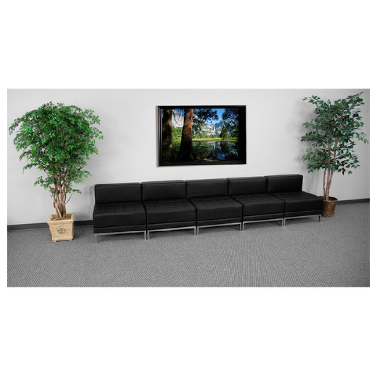 The Flash Furniture ZB-IMAG-MIDCH-5-GG Hercules Imagination Series Lounge Set is an adaptable and sophisticated seating solution designed for both commercial and residential spaces. With overall dimensions of 140"W x 28-3/4"D x 27-1/4"H, this lounge set is composed of five modular middle chairs, each measuring 28"W x 28-3/4"D x 27-1/4"H. The set features LeatherSoft upholstery, a unique blend of leather and polyurethane, providing a smooth and soft seating experience. The chairs are designed with a smooth back and tufted seat, enhancing both comfort and aesthetic appeal. Fixed seat and back cushions, made with CA117 fire retardant foam, ensure durability and safety. The robust construction is highlighted by exposed stainless steel accent bars and integrated stainless steel legs. This lounge set requires assembly and ships in two boxes, with in-stock items typically dispatched within 24 hours. Its sleek design and quality materials make it suitable for a range of environments, from upscale offices to trendy lounges, offering both style and functionality to meet diverse seating needs.