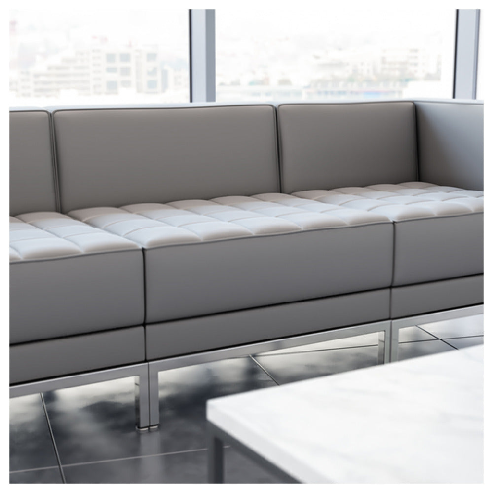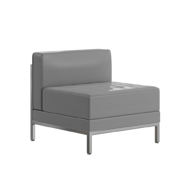 The Flash Furniture ZB-IMAG-MIDDLE-GY-GG Hercules Imagination Series Middle Chair Modular is a versatile seating solution that combines contemporary design with practicality, perfect for diverse market segments such as office environments, waiting areas, or modern living spaces. Engineered with LeatherSoft upholstery, this chair balances comfort with durability, ensuring a premium feel and long-lasting use. The chair's armless design contributes to its modular capability, allowing for customizable seating arrangements suited for any spatial layout. Featuring a smooth back and tufted seat, it provides a sleek aesthetic while maintaining user comfort. The fixed seat and back cushion ensure stability and support, essential for prolonged sitting. Complying with CA117 fire retardant standards, the chair incorporates safety without compromising on style. The exposed stainless steel accent bar and integrated stainless steel legs not only enhance the chair's modern appeal but also provide robust support. Available in an elegant gray color, the product requires assembly upon delivery. Furthermore, quick dispatch within 24 hours ensures timely availability. The Flash Furniture ZB-IMAG-MIDDLE-GY-GG Hercules Imagination Series Middle Chair Modular is a blend of style, comfort, and functionality, making it a compelling choice for varied industry needs.